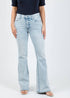 Step into vintage-inspired style with the PISTOLA Kinsley Ultra Flare Leg Jeans in Serenity, featuring a mid-rise waist and flared leg design for a relaxed fit. Crafted from an ultra-comfortable stretch denim blend of 76% Cotton, 13% Rayon, 10% Polyester, and 1% Polyurethane, these jeans offer both comfort and style. Designed with a light blue wash, subtle fade, and whiskering details, they come with a rise of 10.25 inches, a 33-inch inseam, and a 23-inch leg opening. Closure: Button closure. Care: Machine wash and tumble dry. Model is wearing a size 26 (Faryn is 5'6" tall with a 34" bust, 28.5" waist, 31" hip, and 29" inseam).