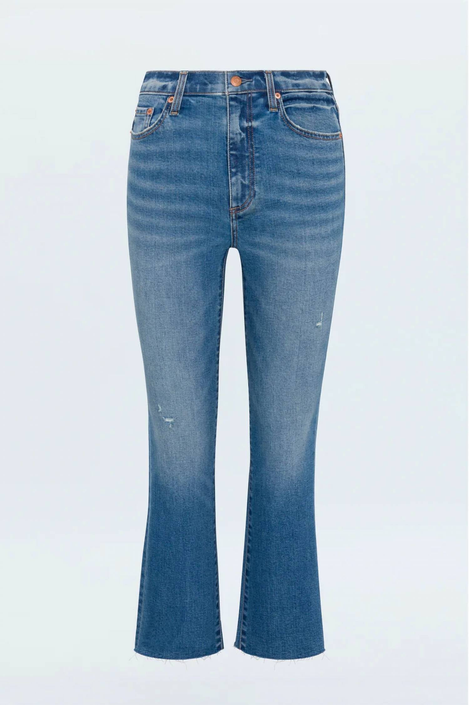 Just add boots! High rise waist with a boot cut leg silhouette and cropped ankle hem. Crafted from our best selling comfort-stretch denim. Offered in a medium-dark blue wash with whiskering and fading. • Rise: 11" • Inseam: 27" • Leg Opening: 16 1/2" • Model is 5’9” wearing size 26 • 94% Cotton / 5% Polyester / 1% Elastane • Imported