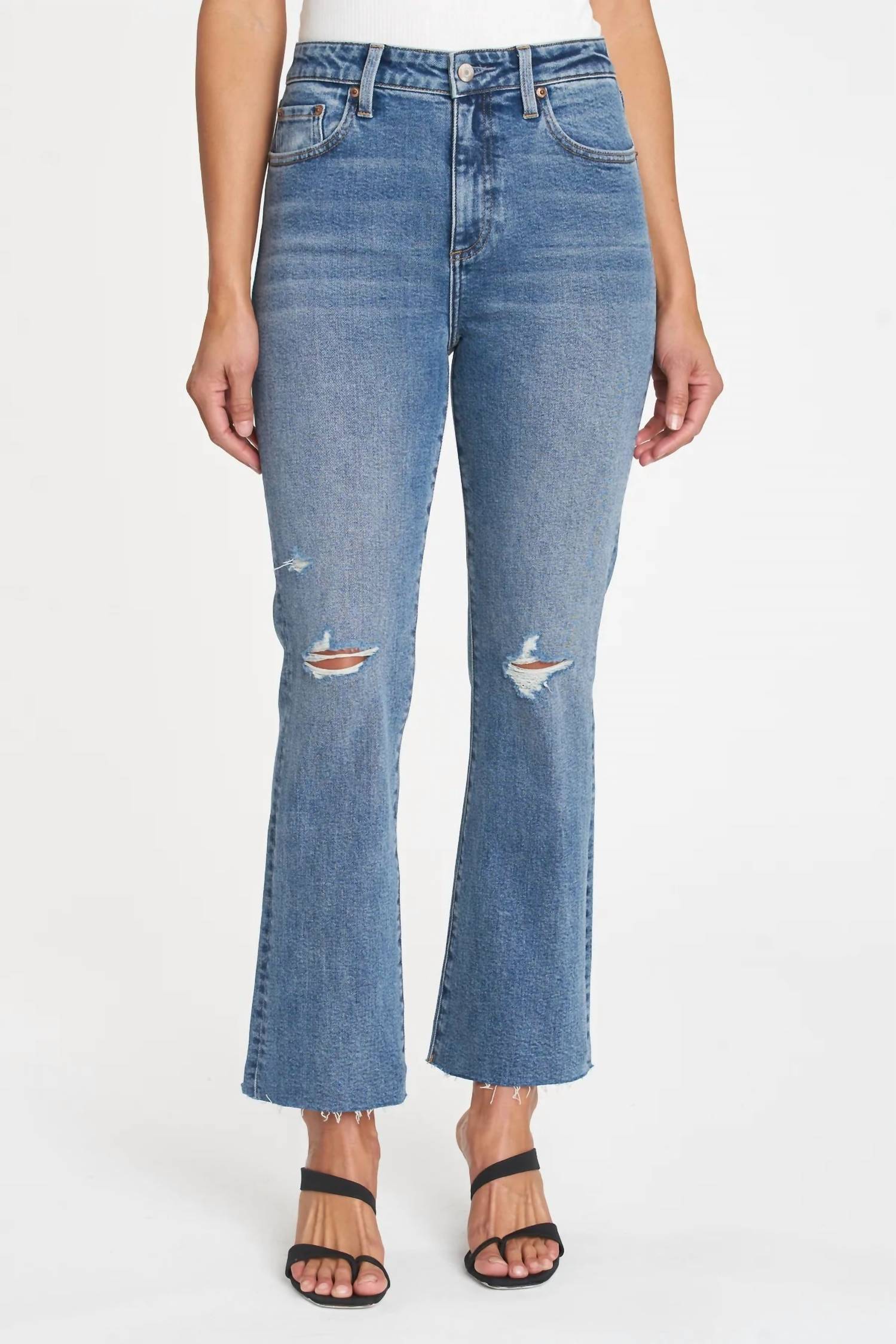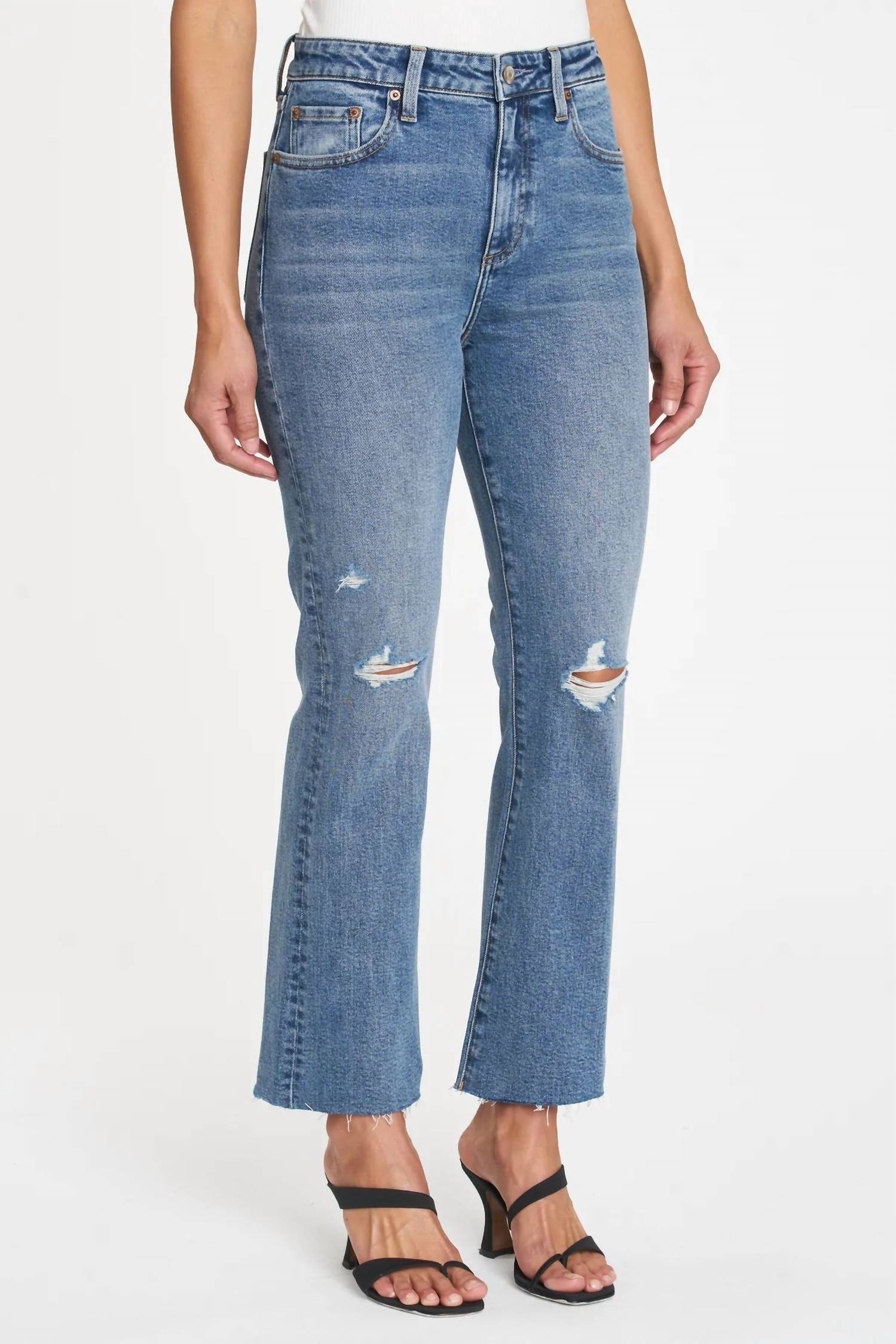 High-waist is here to stay and we especially love this style. The Lennon is the signature high-rise cropped boot cut. It hugs you from waist to knee and flares out at the ankle. This classic, medium wash style features subtle fraying at the hems. Rise: 10 3/4" | Inseam: 27" | Leg Opening: 16". Model is 5'10" wearing a size 26. 72% Cotton / 27% Rayon / 1% Spandex. Wash cold. Imported.