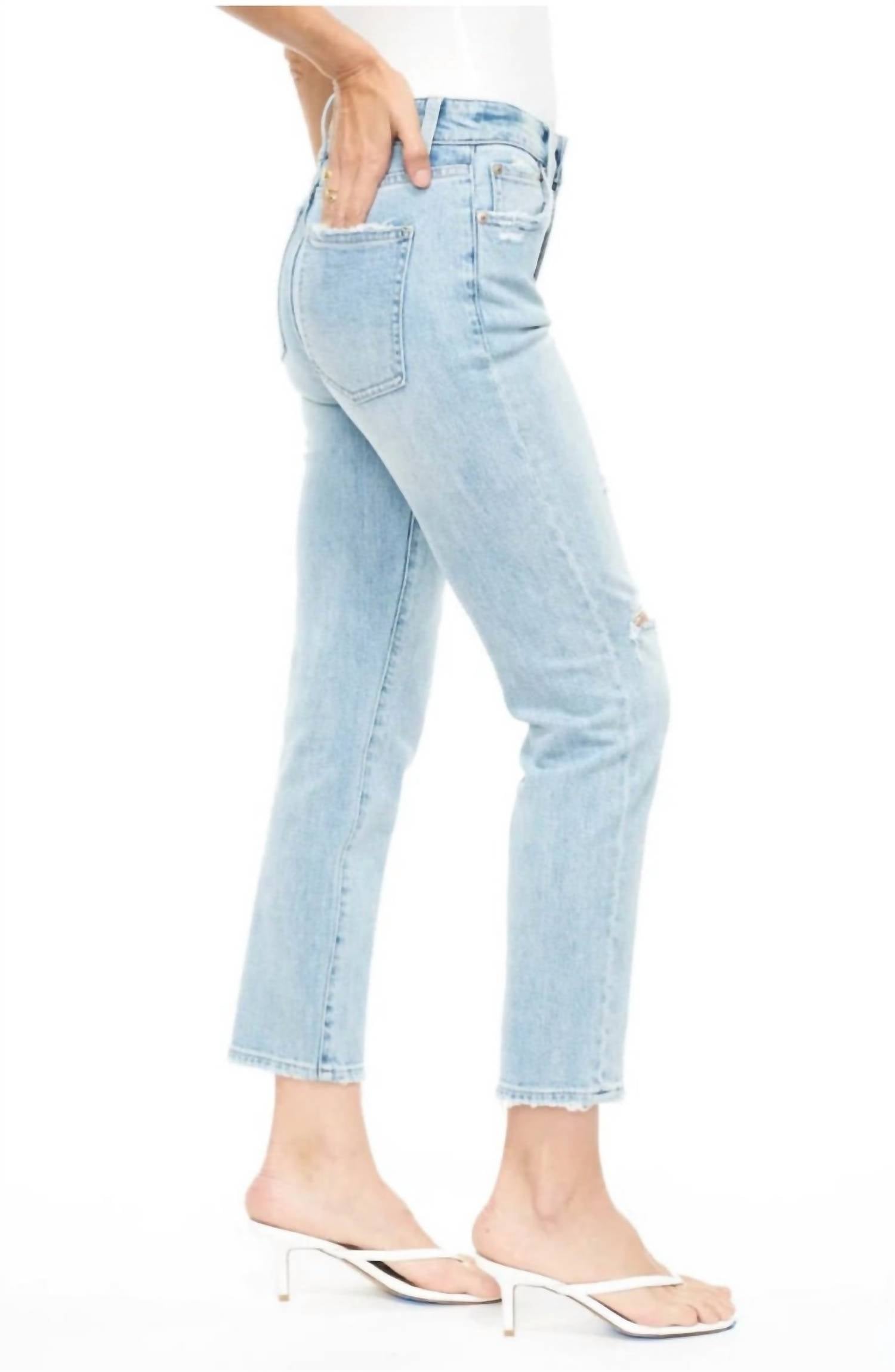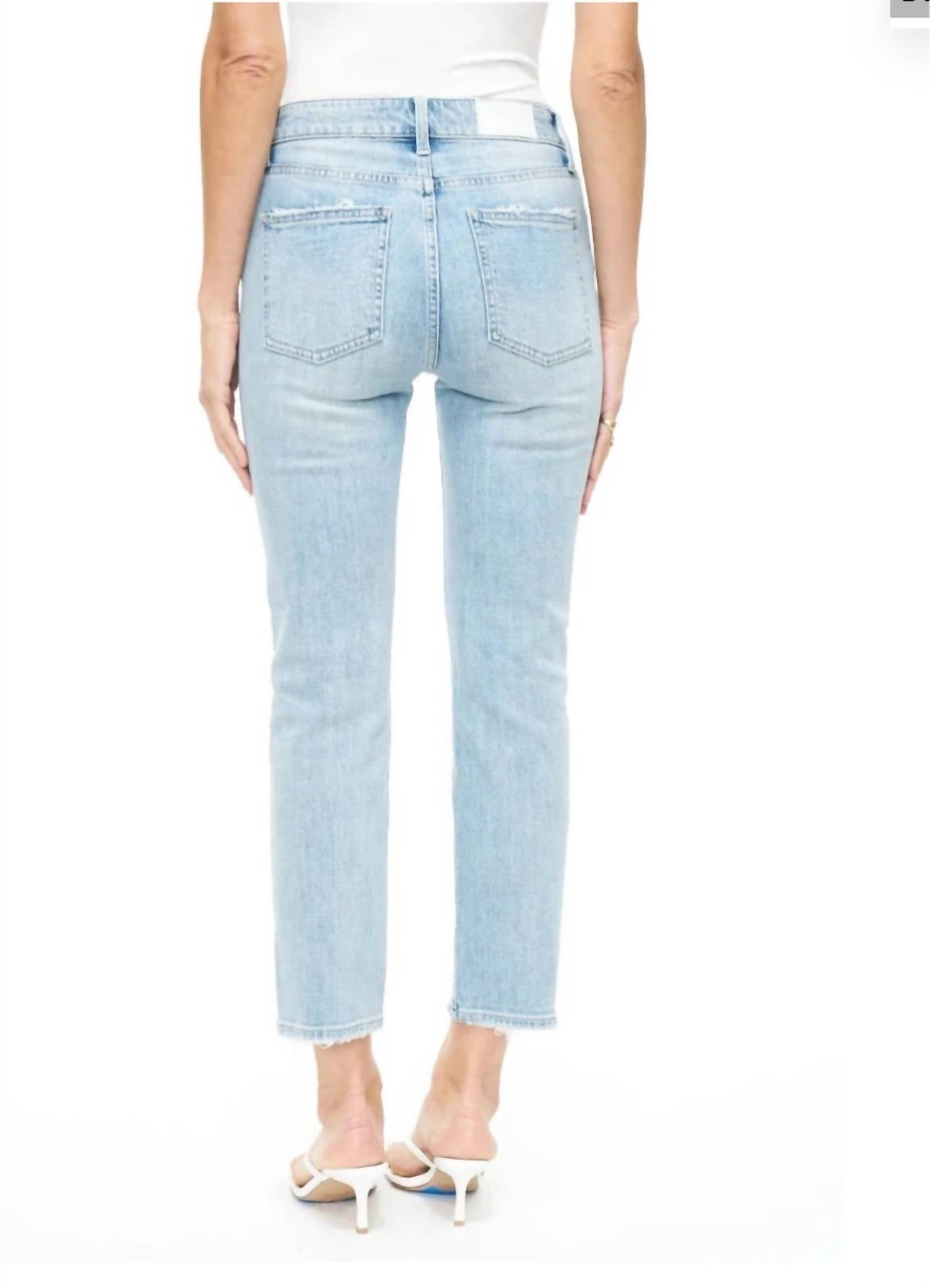 High-rise. Comfort stretch slim cigarette jean. Double knee slit. Rise: 10". Inseam: 26 1/2". Leg Opening: 13 1/2". 72% Cotton. 27% Rayon. 1% Spandex. Imported.