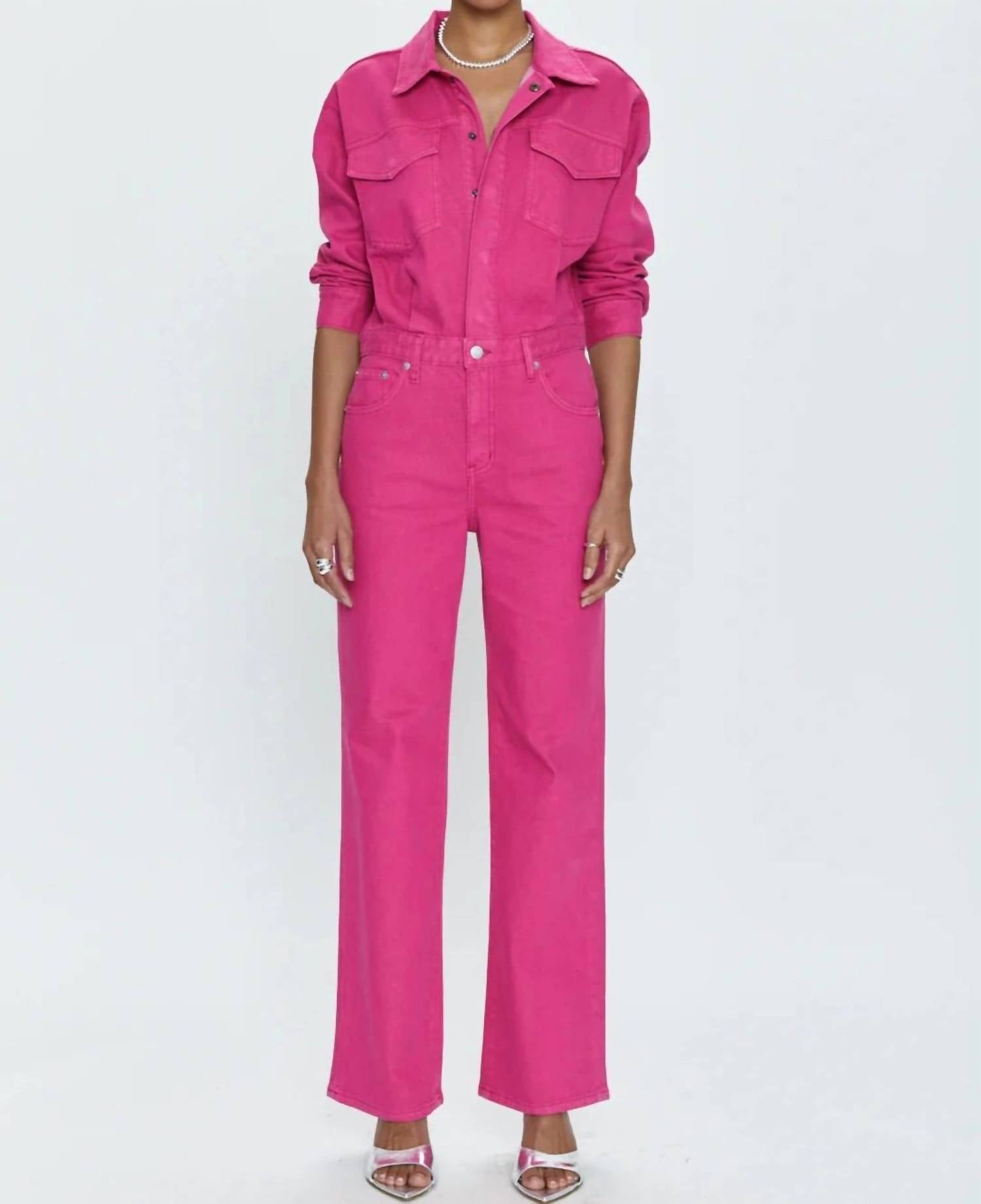 Elevate your style with the Nikki Jumpsuit by PISTOLA, designed in a vibrant Pink Garnet hue to make a striking impression. Featuring a snap front closure with a zippered fly, this jumpsuit creates an effortlessly chic look that can be dressed up or down as needed. Crafted from a comfortable blend of 72% Cotton, 27% Poly, and 1% Spandex, it offers a versatile straight leg cut and convenient pockets. Enjoy easy care with machine wash instructions for hassle-free maintenance.