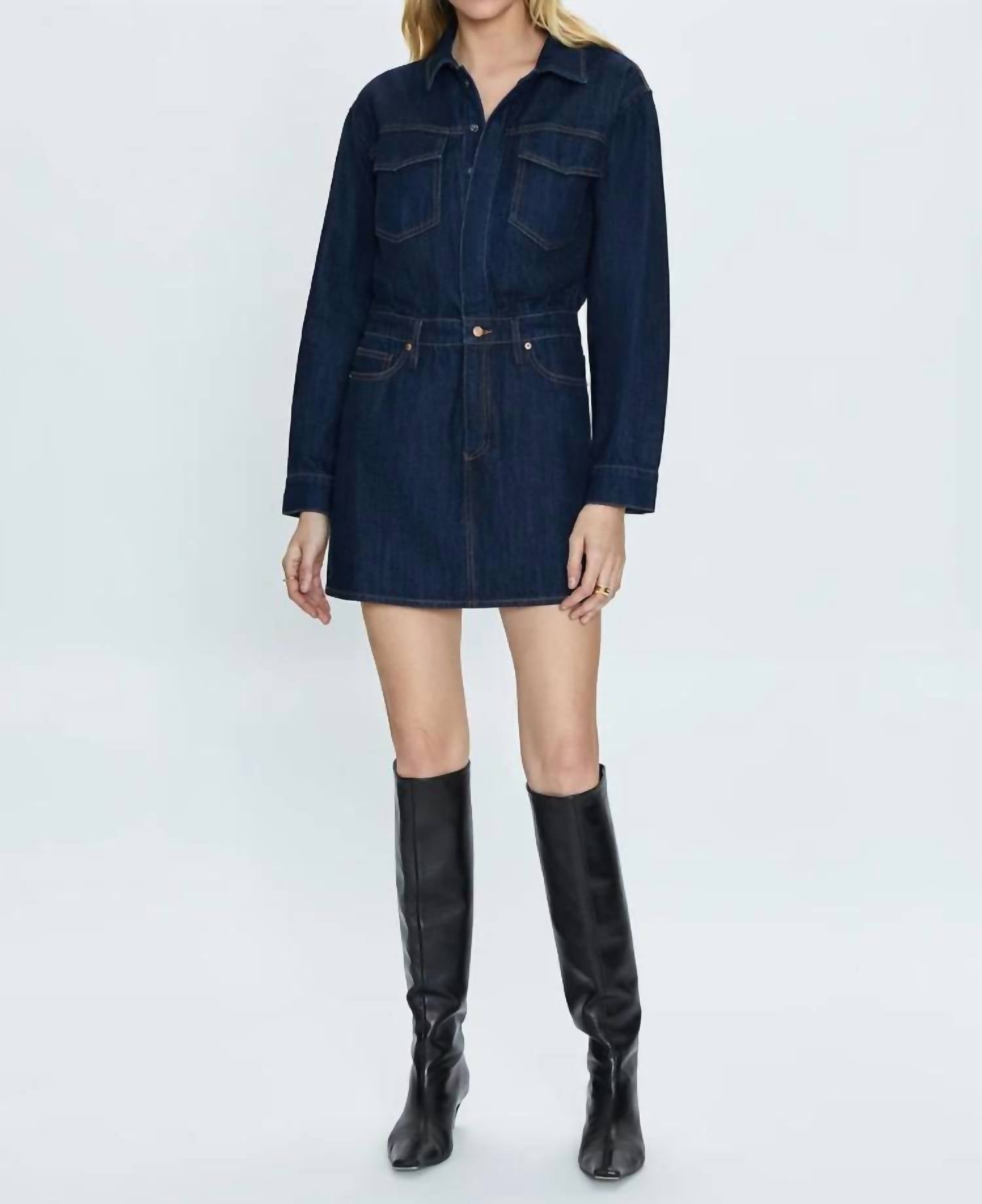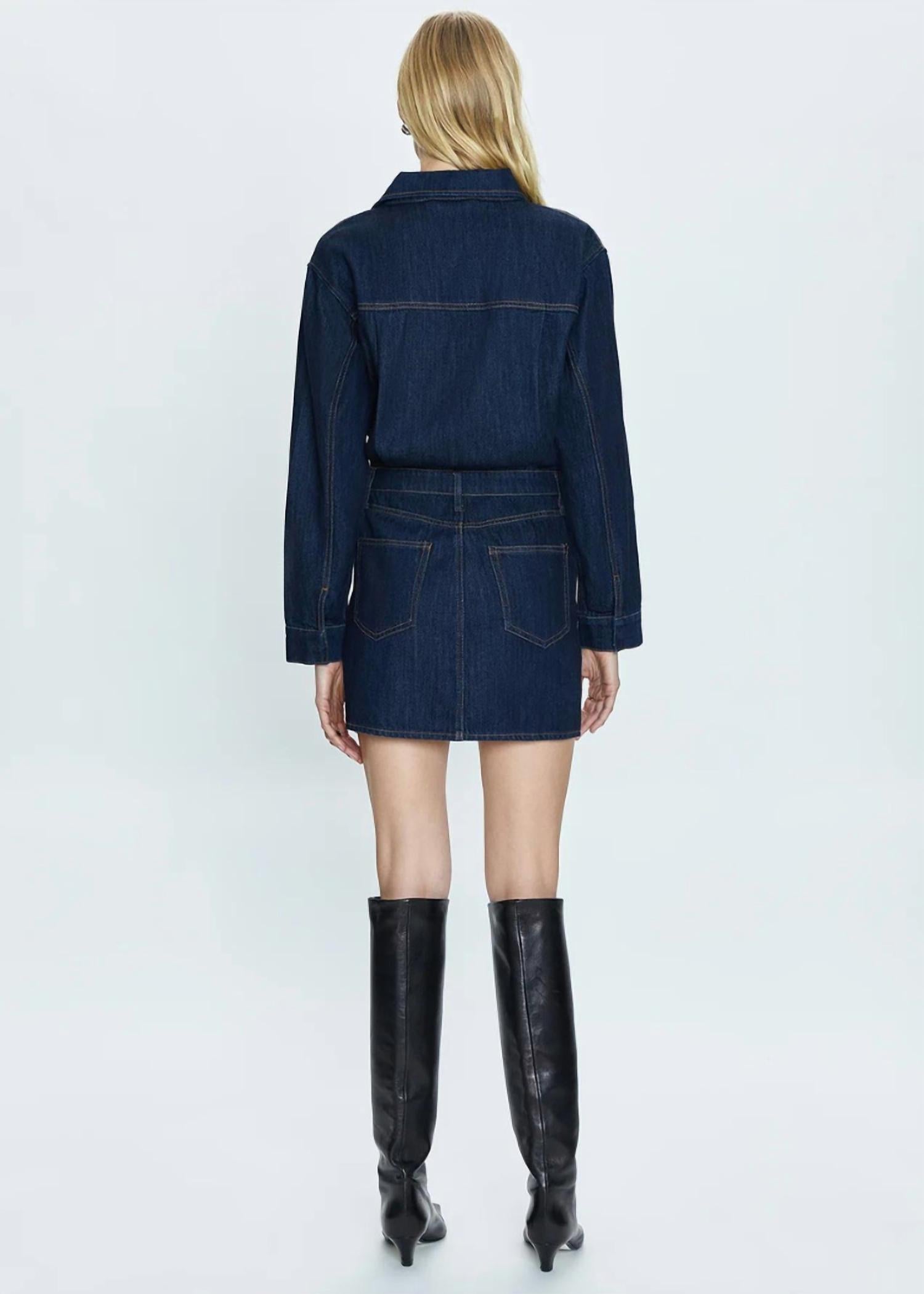 A short and breezy dress for those warmer days. The Nina Denim Mini Dress by Pistola in the cool dark wash Iggy will be your essential piece for an effortless, off-duty look. With its long sleeves and six pockets, this dress is designed for both style and functionality. Made from 100% cotton, it features a practical zip up front with snap closure and frayed hem for added edge. Size XS measures 31" in length. Care instructions: Machine wash cold, tumble dry low.