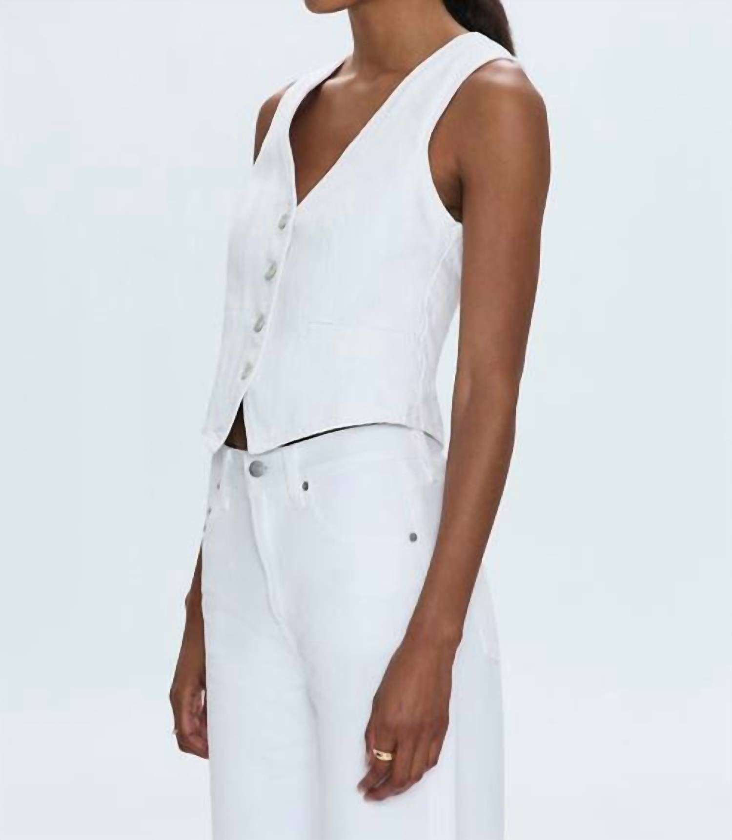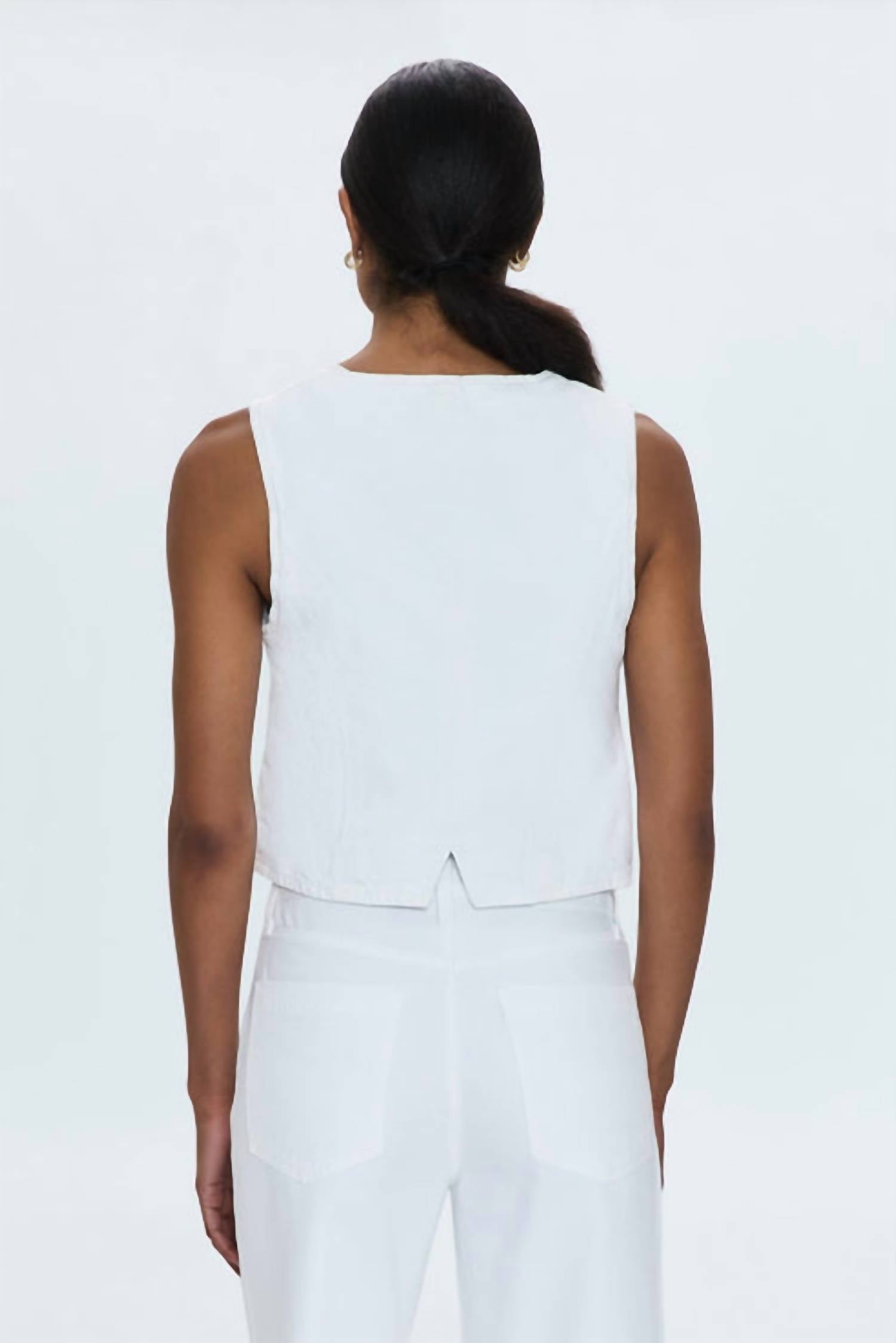 That extra layering piece you didn't know you needed! Elevate your summer wardrobe with the Vero Vest by PISTOLA, a minimalist piece perfect for evening events. This solid white vest features a sleeveless design and a sophisticated V-neckline. Constructed from cotton, it offers timeless style with functional pockets for added convenience. Closure is via buttons, and it is easy to maintain with machine wash care instructions.
