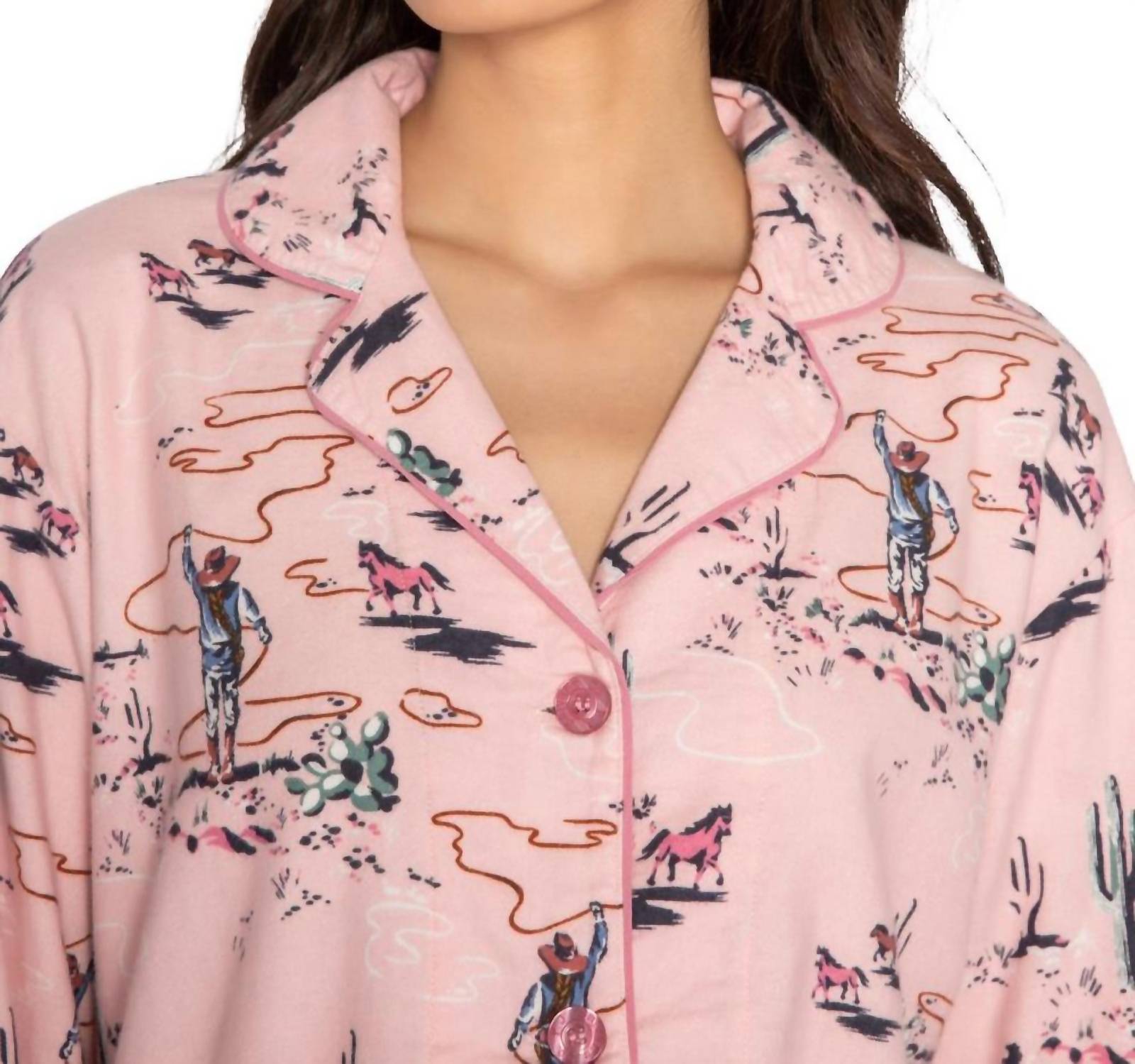 Introducing the PJ Salvage Flannel Pajama Set in Pink Mist, a cozy choice for horse lovers with its western-inspired print and embroidered "Wild Heart" cuff. This set includes a flannel long sleeve top and matching pants crafted from 100% cotton flannel, renowned for its softness. Designed with a collar neckline, this preppy set makes an ideal gift, complete with a matching hair wrap and band. Care: Machine wash cold, tumble dry low; handle with care.