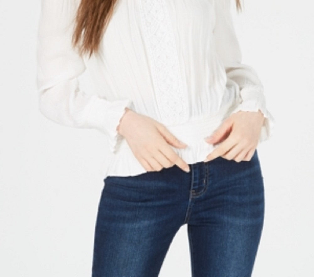 Smocked details and crochet trim add a touch of boho style to Planet Heart's off-the-shoulder top with long sleeves