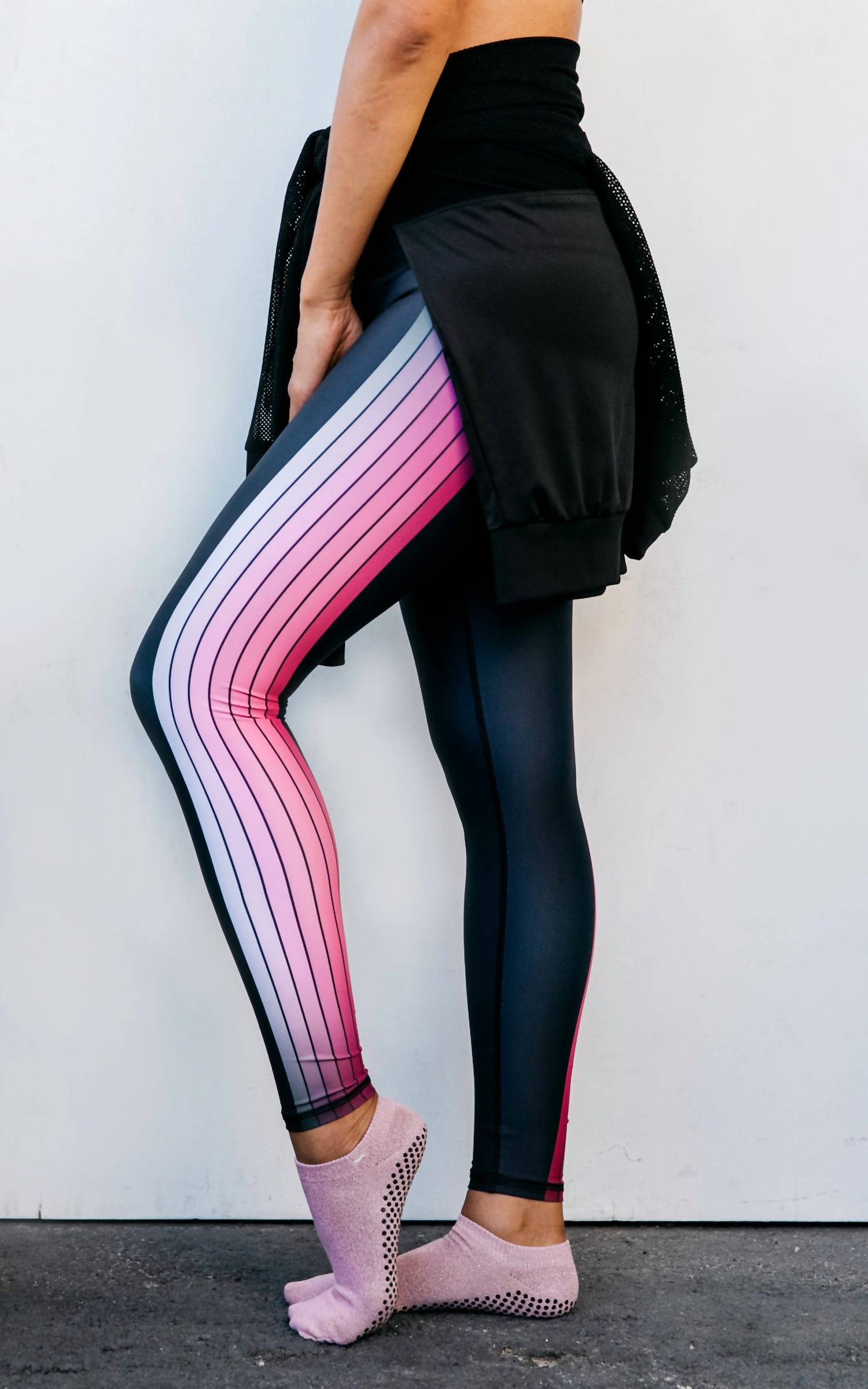 Elevate your vacation wardrobe with the Women's Fame Pink Track Mid Rise Legging by Playground, featuring a stripe pattern in chic Black Multi. Designed for a mid-rise fit, these leggings offer a 26" inseam across all sizes and boast a skinny leg style. Handcrafted with care in Los Angeles, the four-way stretch material and triangle gusset ensure comfort and flexibility. The pull-on closure and easy care—wash cold inside out and hang dry—make these leggings a practical yet stylish choice. Model is 5'6" wearing a size small.