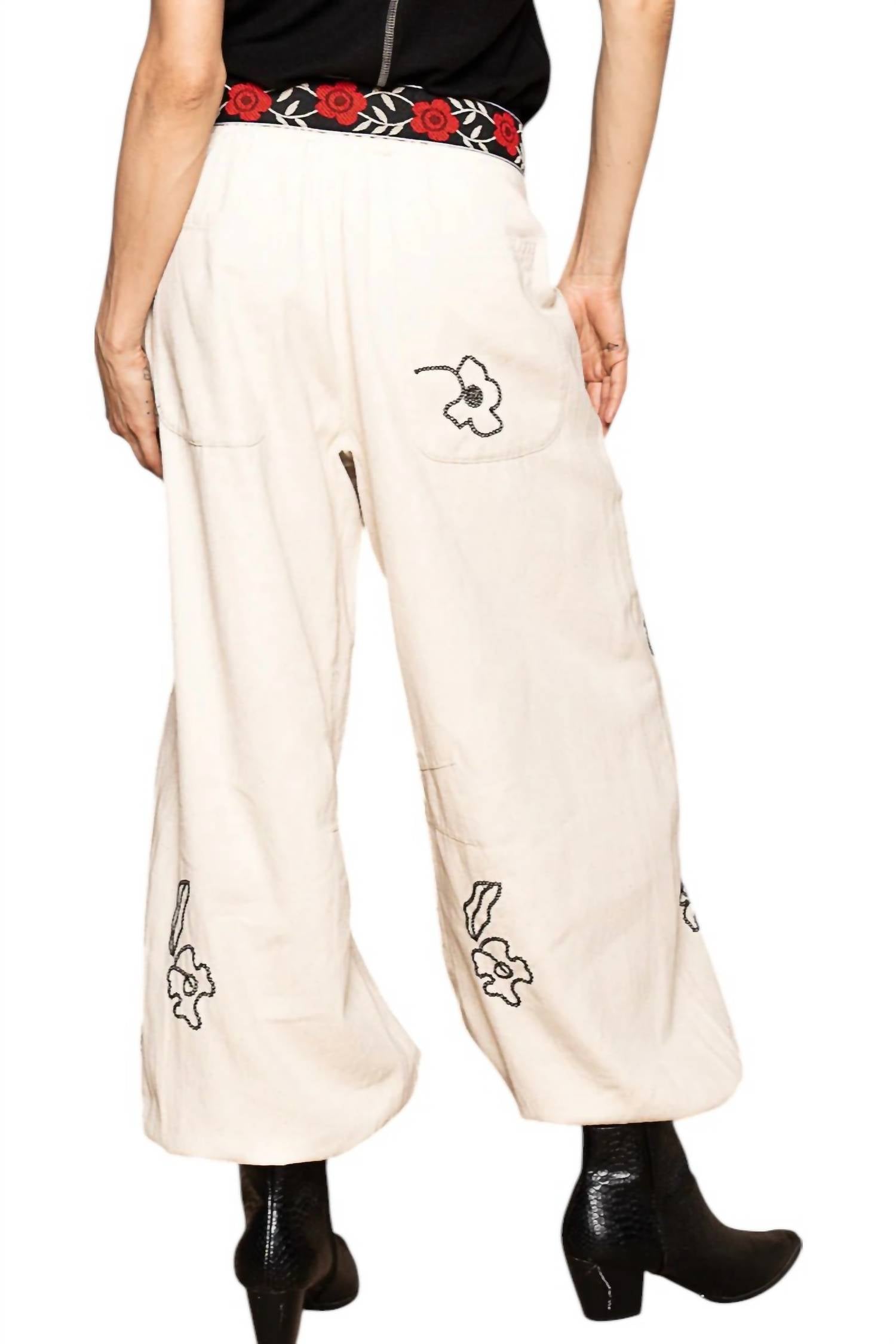 Designed to elevate your fall wardrobe with a touch of Western flair. High-rise, oat milk-colored joggers feature exquisite soutache floral embroidery and offer a relaxed, true-to-size fit. Crafted from 100% cotton twill. Include front pockets and elastic ankle cuffs for added comfort. Button closure. Machine wash and tumble dry.