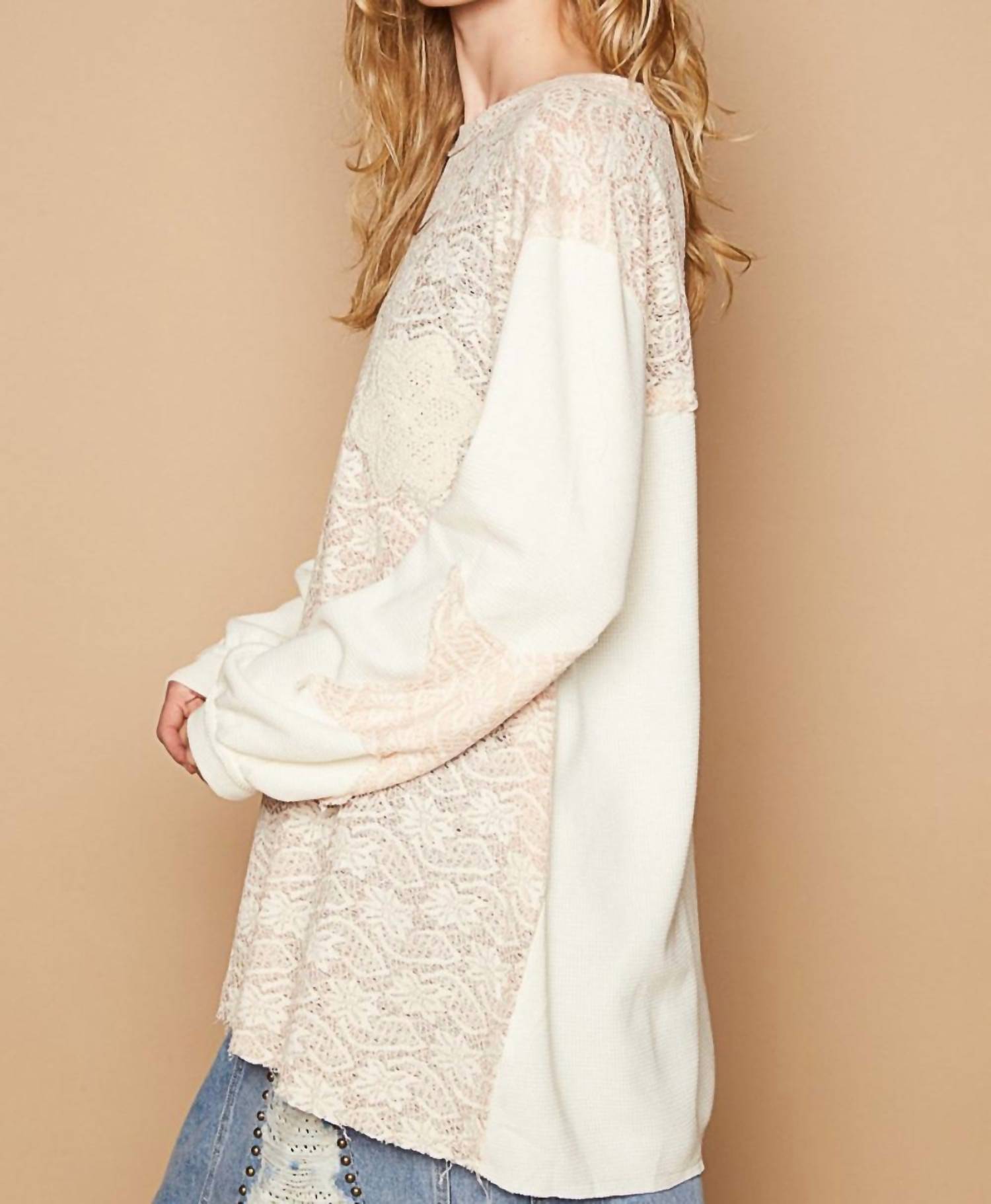 Great fit, cute design, soft fabric. You'll love everything about this long sleeve tee. The Round Neck Long Sleeve Crochet Patches Top by POL adds a stylish touch to your wardrobe with its creamy beige color and floral pattern. Made from 100% polyester, this semi-sheer top features lace details and a relaxed fit, perfect for both casual and dressy occasions. Closure is easy with a pull-on style, ensuring comfort with its long sleeves. Care is straightforward with machine wash cold and tumble dry low instructions. Sizes are available to fit various bust and waist measurements for an ideal fit. Imported with detailed product measurements: S: Bust 34-36 in, Waist 26-28 in, M: Bust 37-38 in, Waist 29-31 in, L: Bust 39-40 in, Waist 32-33 in.