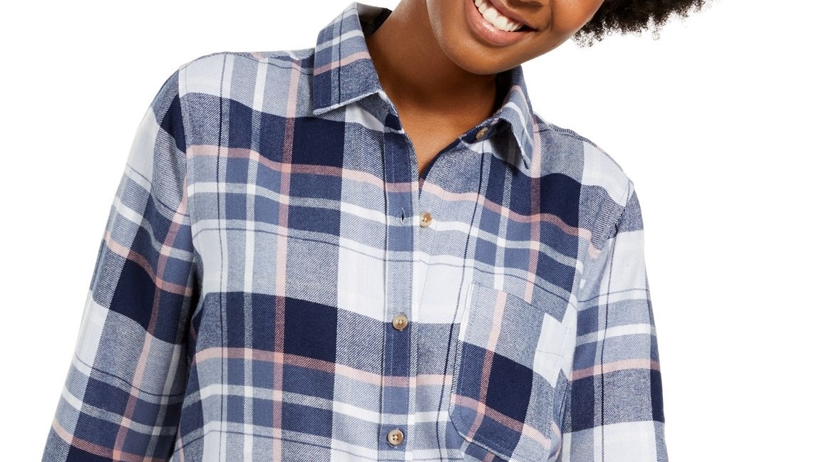 Ask a question about Polly & Esther Juniors' Plaid Utility Shirt Blue Size Small