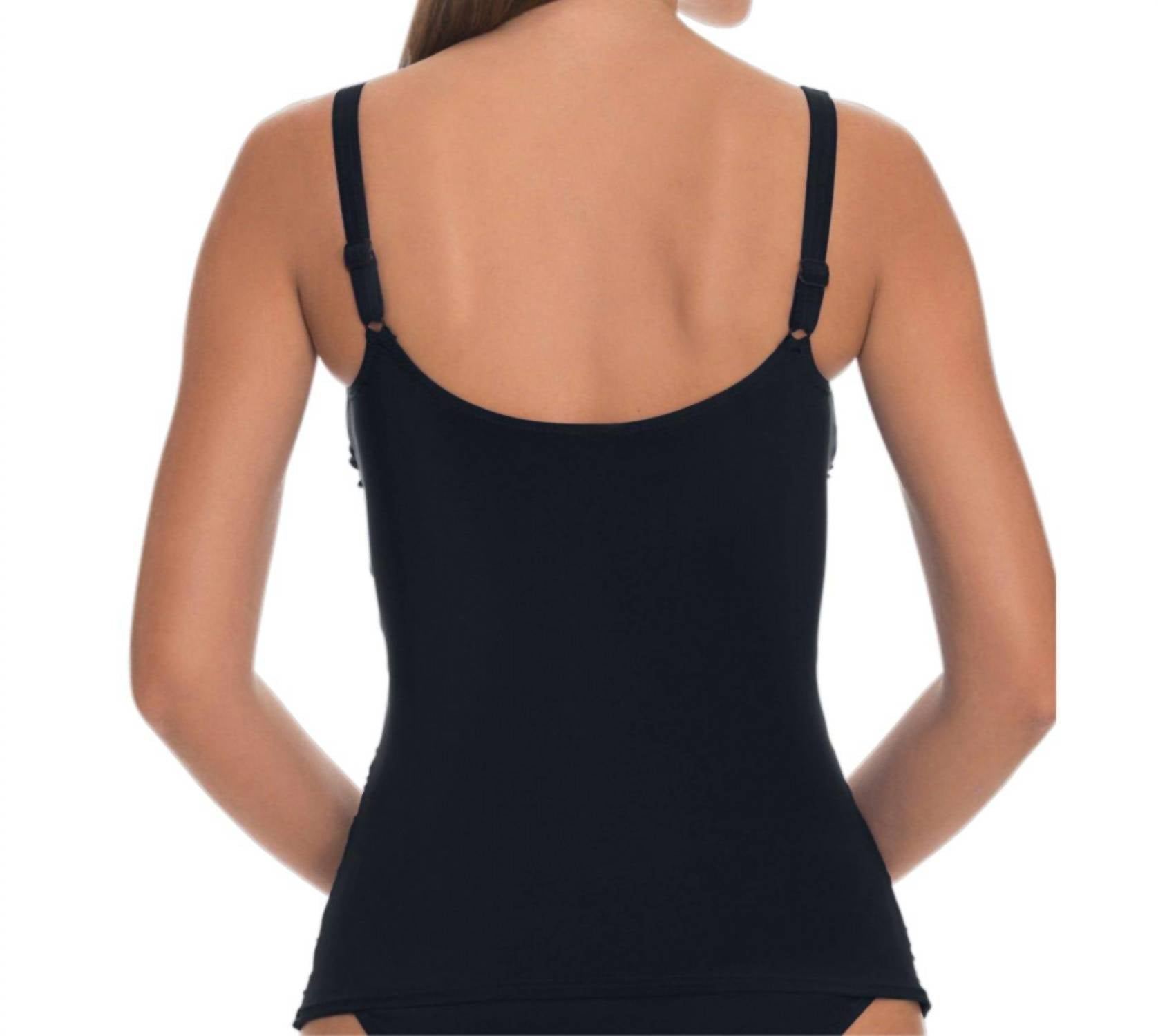 This Tankini Top features a soft cup. Scoop neckline. Visually slim torso with shirred bodice. Slide adjustable straps. Polymide, Elastane.