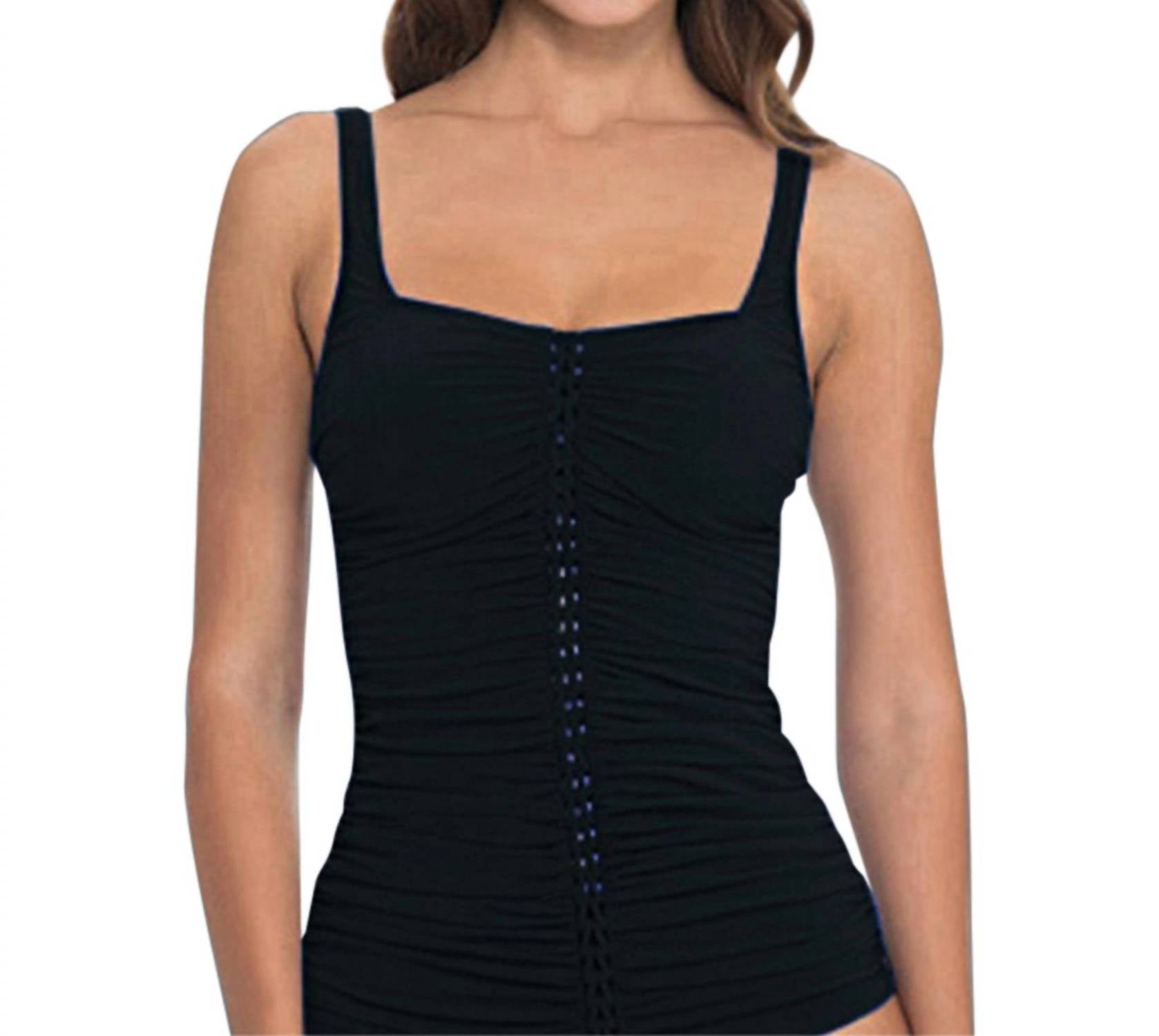 Dream of your next beach getaway in this cute little number. Pair with strappy sandals, a floppy hat, and an oversized tote to complete the perfect vacation look. This Tankini Top features a soft cup. Scoop neckline. Visually slim torso with shirred bodice. Slide adjustable straps. Polymide, Elastane.