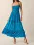 Introducing the women's Solid Maxi Dress by PROMESA, a stunning piece in French Blue that's perfect for any occasion. This ankle-length dress features spaghetti straps, a sweetheart neckline, and an A-line silhouette with a tiered, flared skirt and gathered bodice for added elegance. The composition of 65% Rayon and 35% Polyester ensures a soft and flowy fit, while the open back with self-tie straps and elastic waist provide a comfortable and secure closure. Model is 5'9" with measurements of 34" bust, 26" waist, and 37" hips, wearing a size Small.