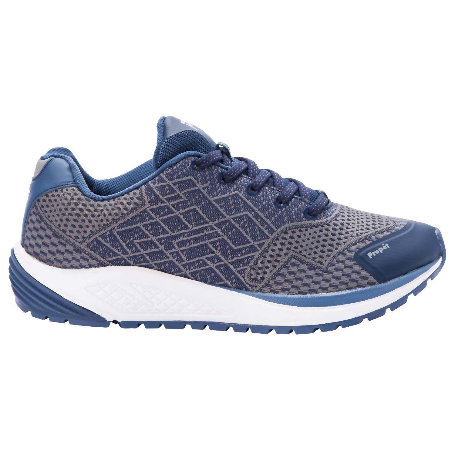 Introducing the Men's One Sneakers by PROPET, designed for optimal performance and style in a captivating navy and grey colorway. These athletic shoes feature an almond toe shape with a mesh and synthetic upper, providing a breathable and adaptive fit. The double footbed adds extra volume and adjustability, complemented by the Ortholite X-25™ Rebound foam insole for superior comfort. A lightweight EVA outsole with rubber inserts enhances durability, offering cushioned support perfect for all-day wear.