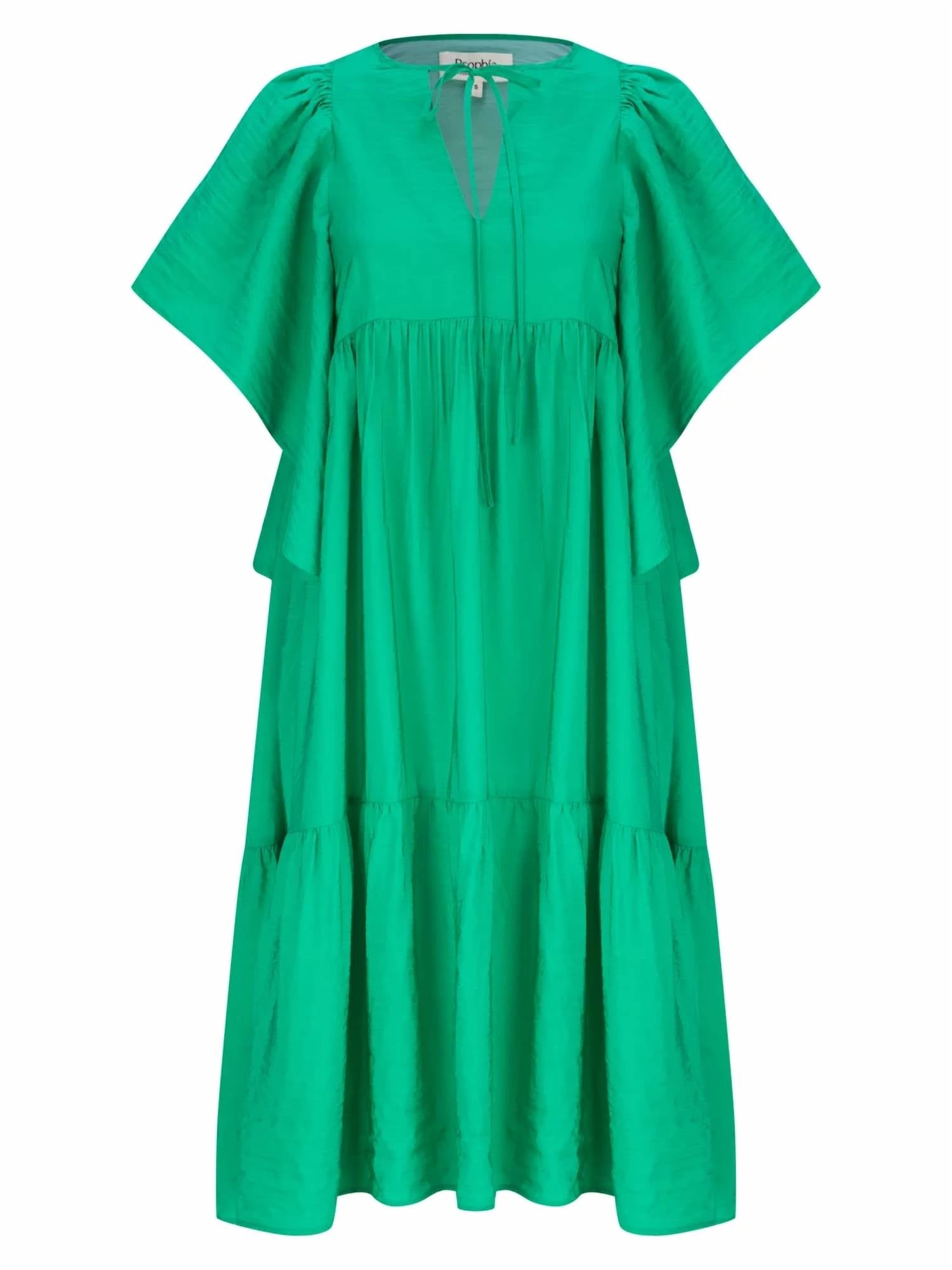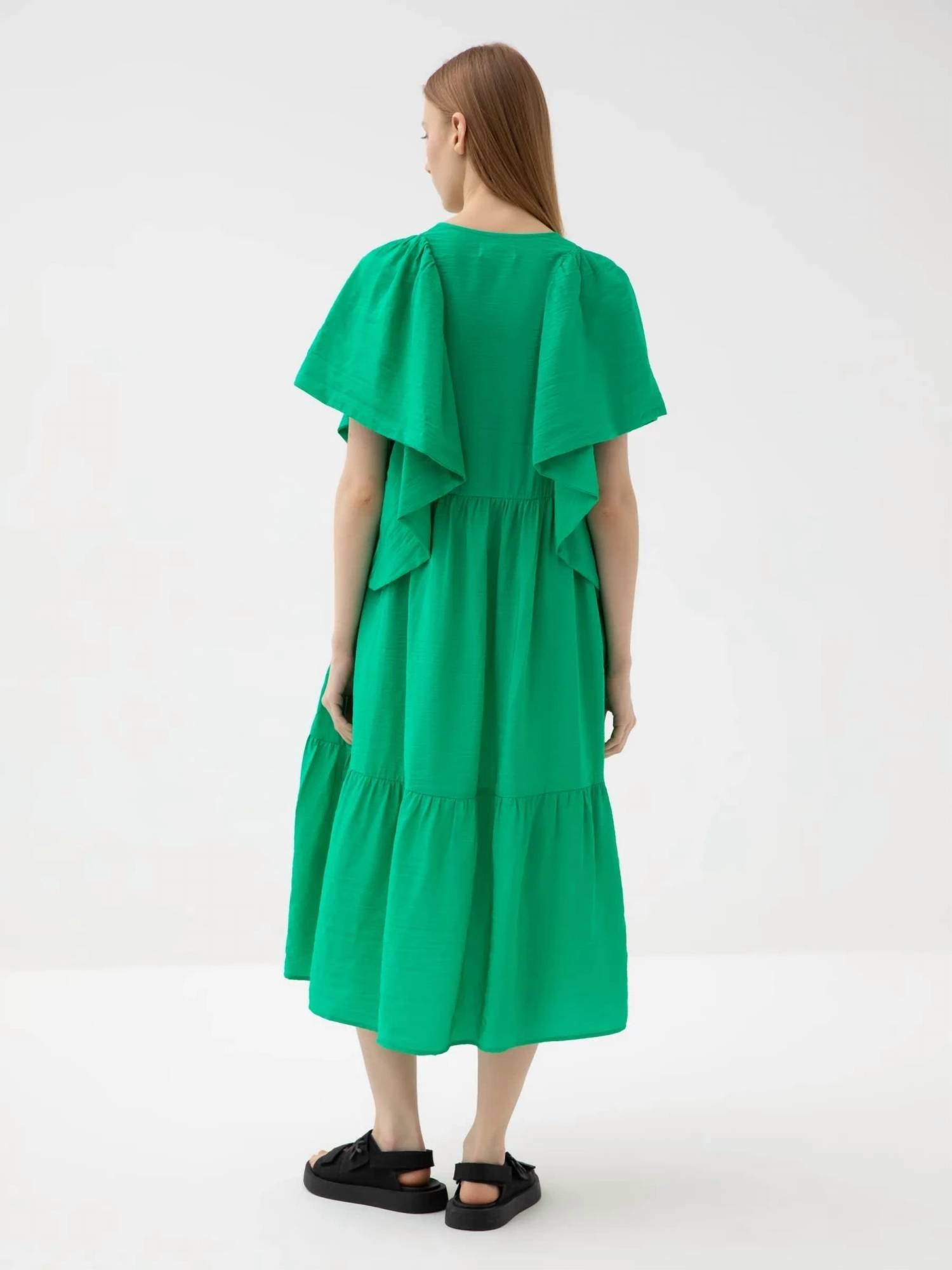 Just add slides or mules and you are good to go. This vibrant green midi dress features a V-neckline with tie detailing, flutter sleeves, a tiered silhouette, and lightweight textured fabric for a breezy and feminine look. 86% Rayon, 14% Nylon.