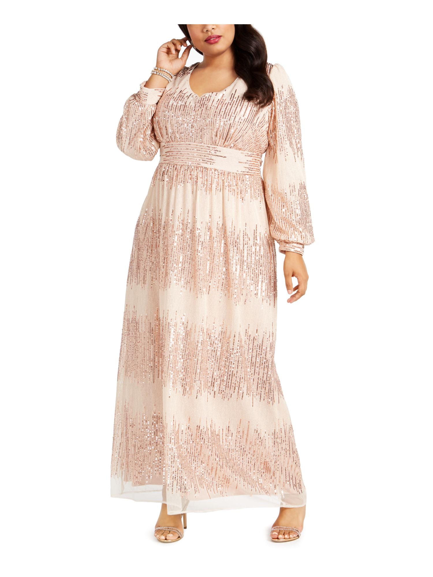 R M Richards Women's Sequined Long Sleeve Jewel Neck Maxi Blouson Evening Dress Beige Size 20W