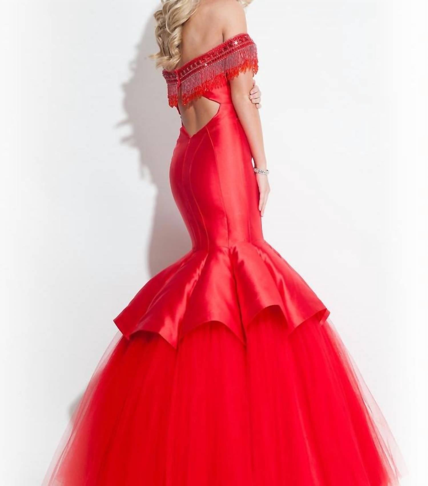 Turn heads in the cutest and most flattering evening dress. Elevate your prom night with the Beaded Mikado Prom Gown by RACHEL ALLAN, a stunning choice in vibrant red. This women's gown features an off-the-shoulder neckline adorned with beads, offering elegance and allure. Crafted from soft tulle with a Mikado fabric overlay, it boasts a dramatic mermaid silhouette and intriguing back cutout. The dress is secured with a zip closure, ensuring a flawless fit for your special evening.