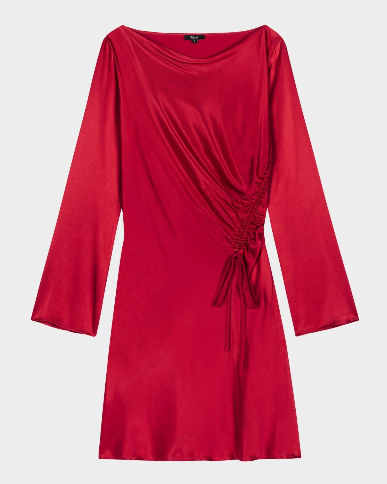 Striking Scarlett lustrous satin piece is designed with a feminine cowl neckline, long sleeves, and adjustable side drawstrings for a perfect fit. Fabricated from a blend of Rayon, Cellulose Acetate, and Viscose. Features an A-line silhouette with a hem that gracefully falls above the knee. Pull-on style. Dry clean only.