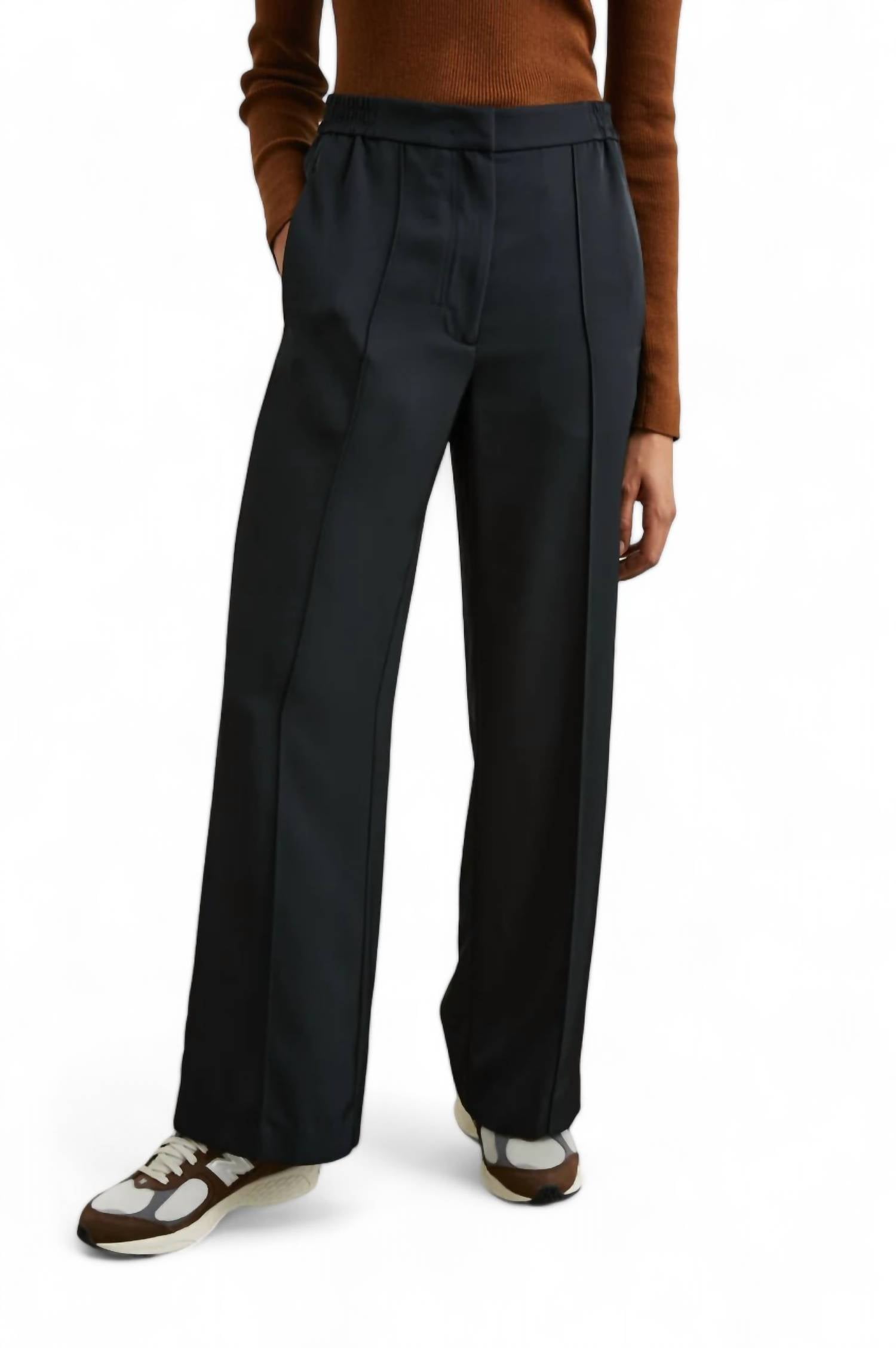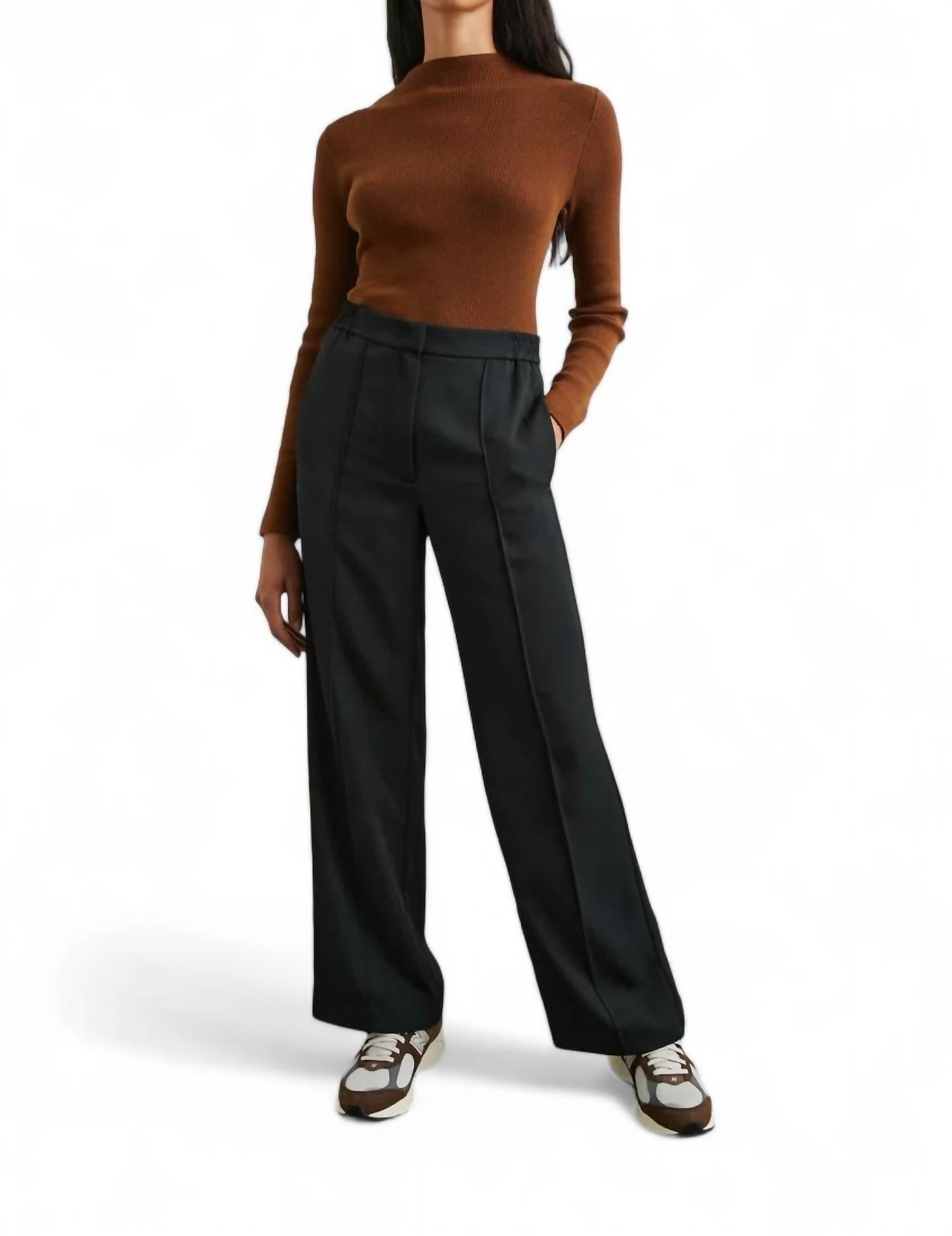 These trousers feature vertical pleating, a straight silhouette, and elastic sides for easy pull-on. Made from 100% polyester, they are dry clean only and true to size. The inseam measures 31 inches (measured from size Small), with a front rise of 12.25 inches.