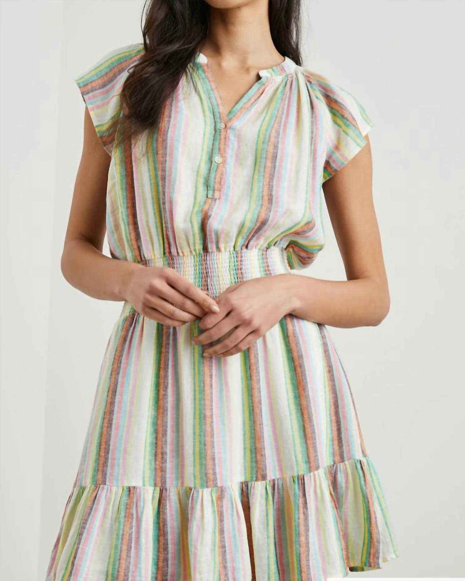 The kind of easy and flattering dress you'll be reaching for all season long. Split V-neckline. Short sleeves. Blouson bodice. Smocked waist. Flounced hem. Button-front closure. 55% linen 45% viscose. Hand wash. Imported.