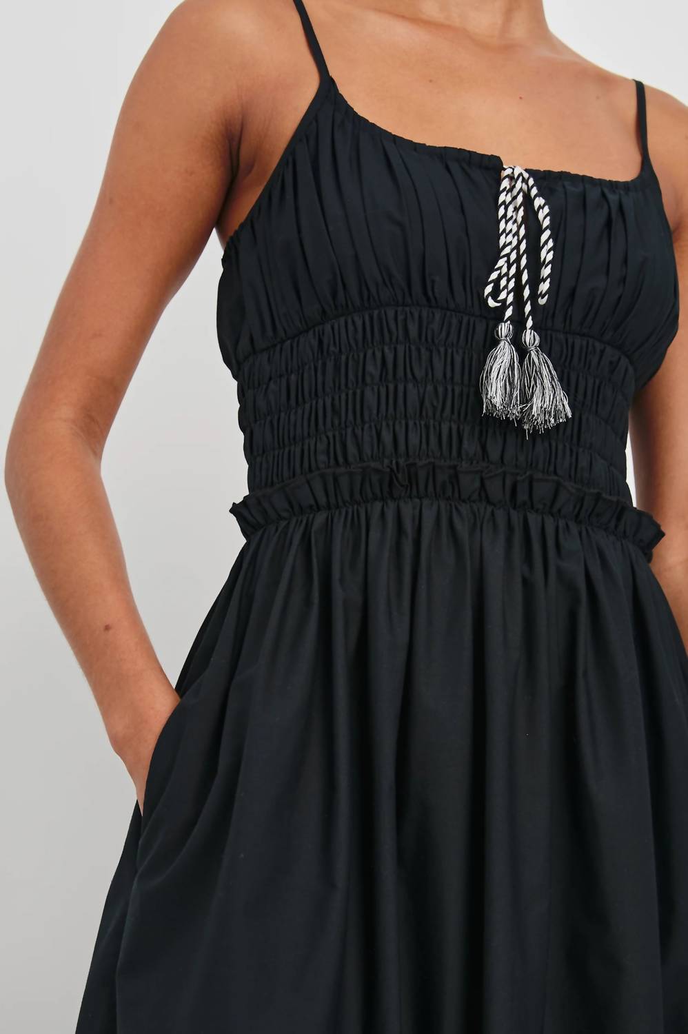 A midi dress so versatile, your options for wearing it are endless. Introducing the Baja Dress by Rails, a tropical-inspired midi designed in Black Ivory Palm Trees. This garment features spaghetti straps, a smocked waist, and a charming scoop neckline with twisted ties and delicate ruffles for a feminine touch. Made entirely from 100% cotton poplin, it combines comfort and style. Closure: Pull-on. Care: Hand wash with similar colors, hang or lay flat to dry, cool iron if needed, do not bleach, do not dry clean. Enjoy the ease of pockets in the A-line silhouette, with a front body length of 39 1/8" for a Small size.