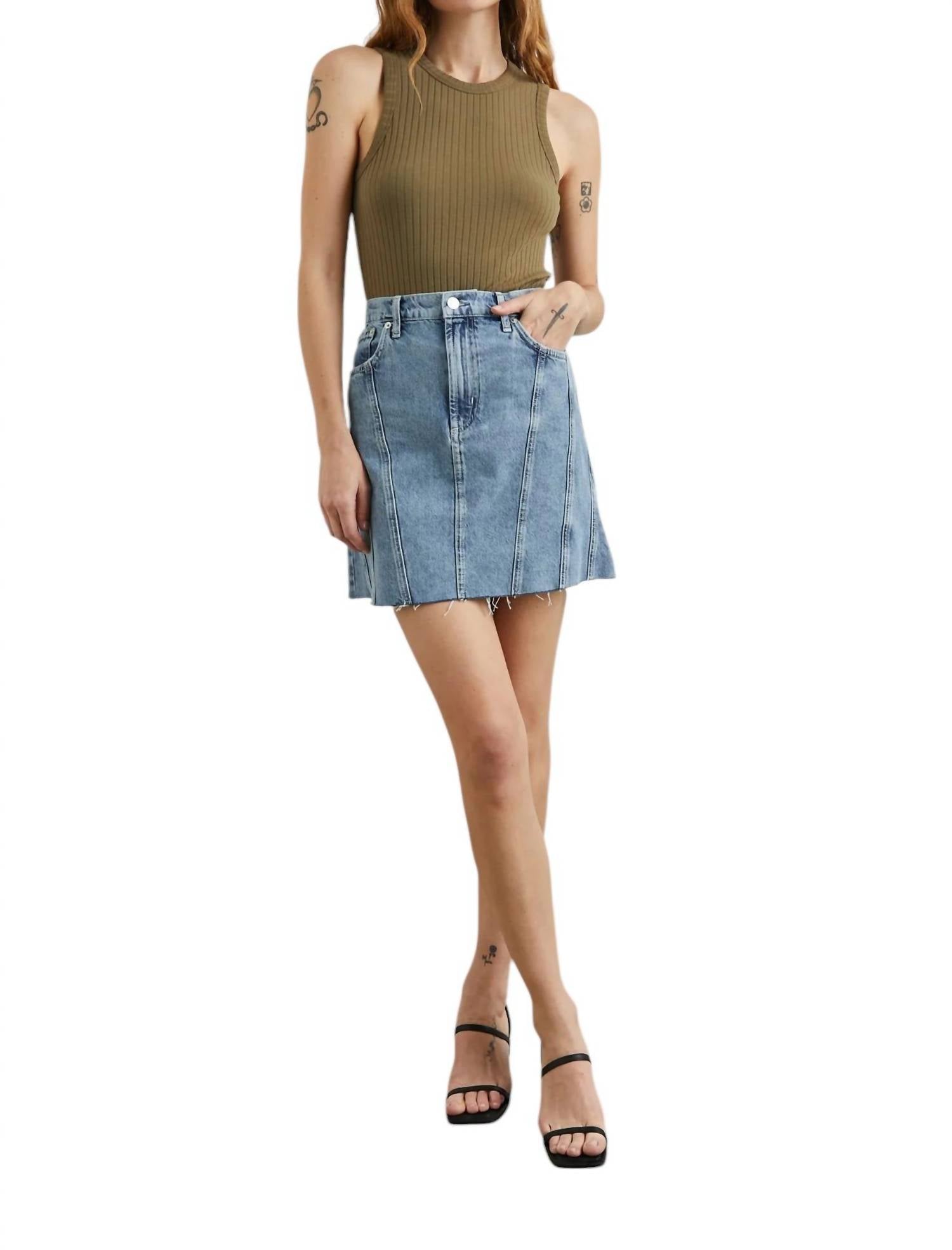 The perfect mini skirt does exist. This Brentwood Mini Skirt features textured seam lines. Made from 80% Cotton and 20% Recycled Cotton, it offers comfort and sustainability, with a button closure and functional pockets.