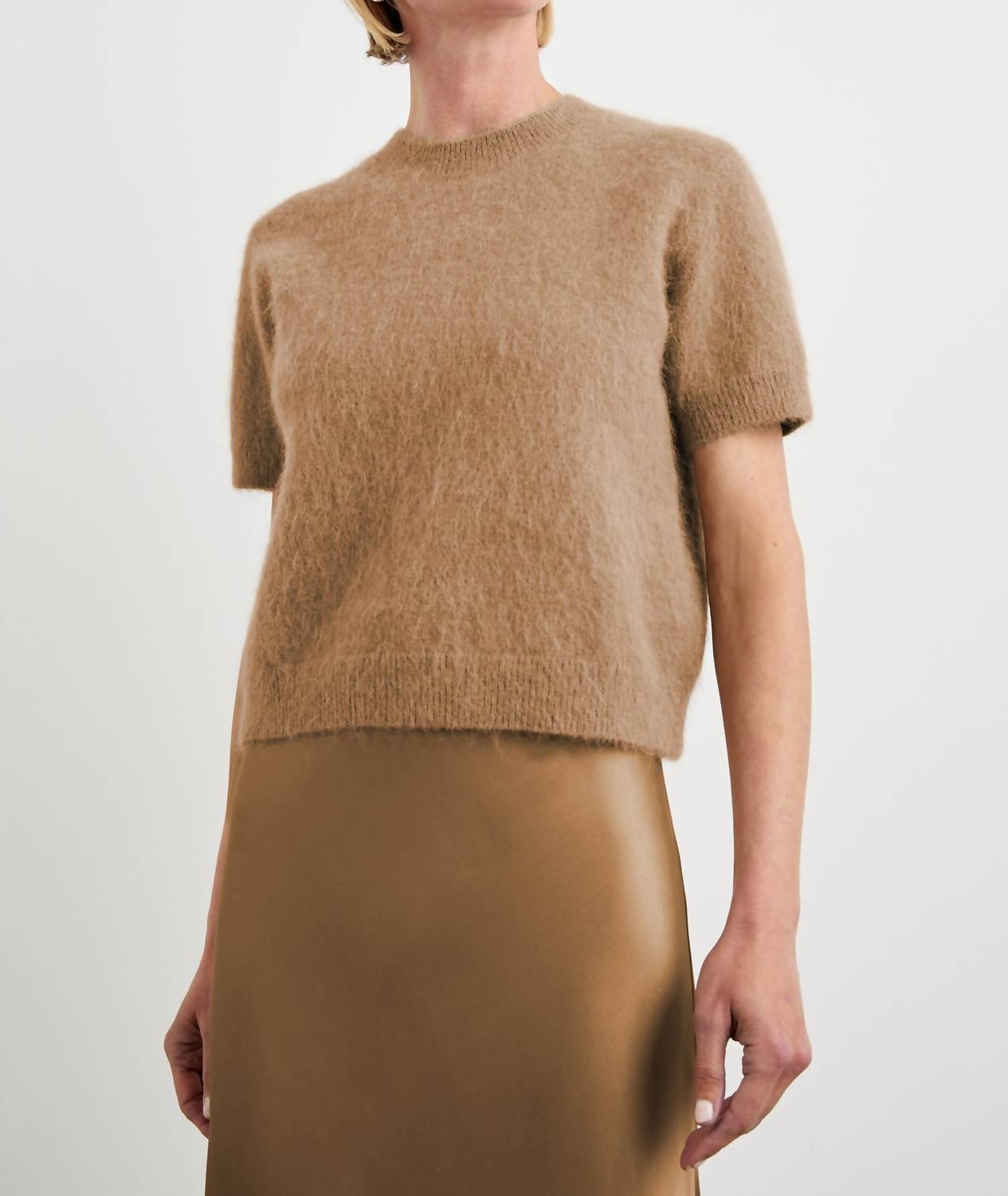 The ultimate go-to sweater, expertly crafted to provide the perfect combination of warmth and style. Its classic design and soft fabric make it a must-have addition to your wardrobe. This short sleeve top, featuring a boxy fit and crew neckline, is crafted from a composition of 58% alpaca, 25% acrylic, 15% nylon, and 2% spandex. With a pull-on closure and a front body length of 20.5 inches, this camel-hued piece is made in China. Dry clean.