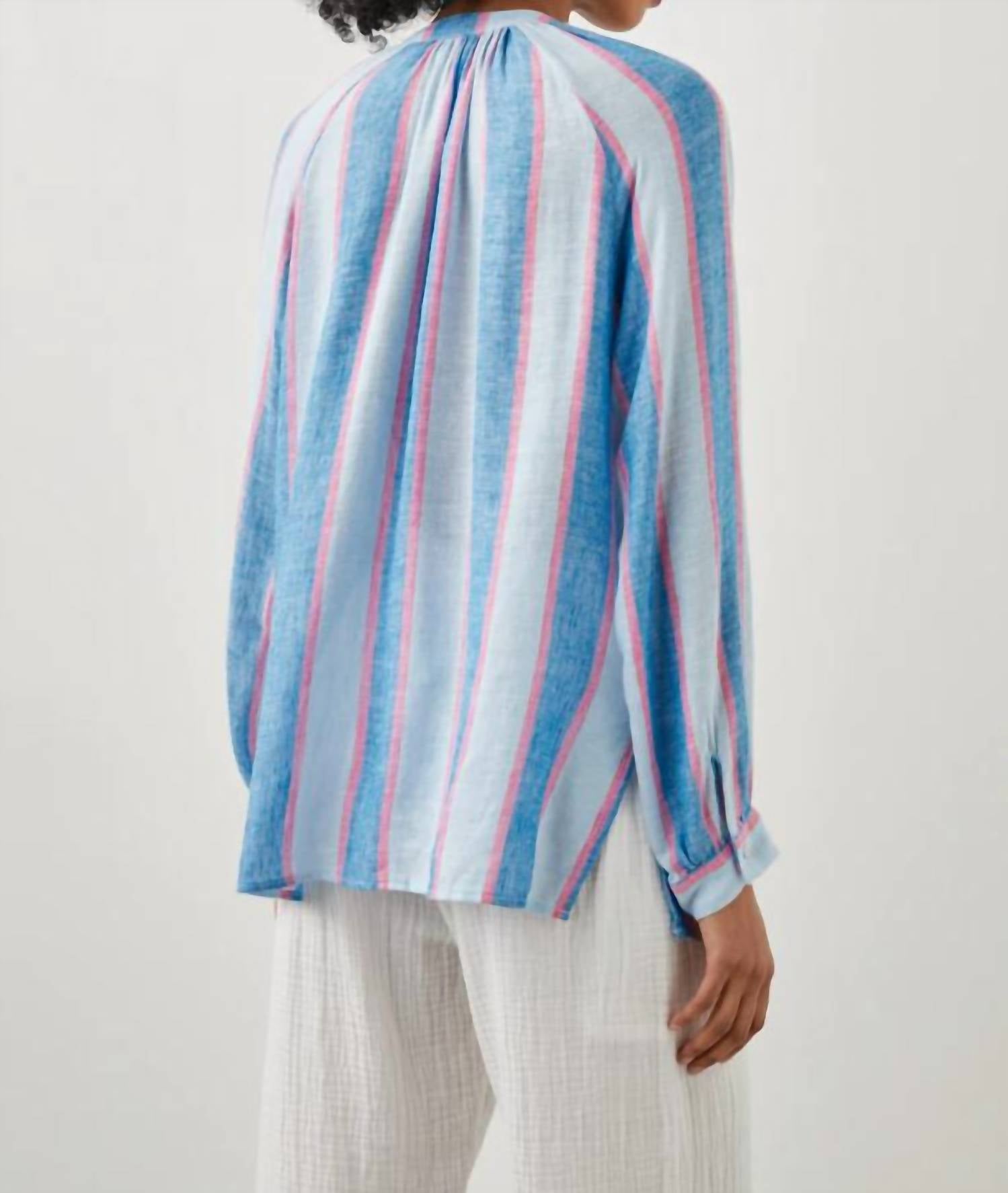 A timeless blouse that will never go out of style. Elevate your summer wardrobe with the Rails Brielle Top in Kona Stripe, a perfect fusion of style and comfort. This breezy long sleeve blouse features raglan sleeves and a v-neck with two adjustable ties, making it ideal for various settings. Crafted from a luxe blend of 55% Linen and 45% Rayon, this striped top offers a lightweight feel for sunny days. Closure: Tie closure. Care: Hand wash and lay flat to dry.