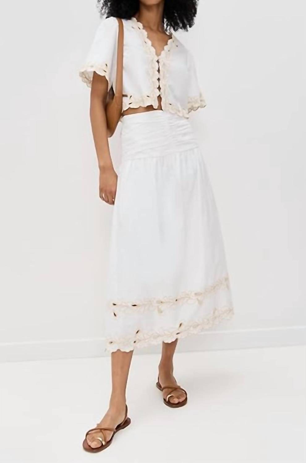 Pair this crop top with your favorite high-waisted jeans or maxi skirt. Discover the beauty of the Rails Cataluna Top, an exquisite women's crop top in white that showcases short sleeves and a charming V-neckline. Crafted from 100% cotton, this trendy top offers a flattering cropped length and is adorned with intricate embroidery and scalloped edges. The button closure features elegant natural shell buttons, adding a touch of luxury to its design. For care, simply hand wash to maintain its delicate features.