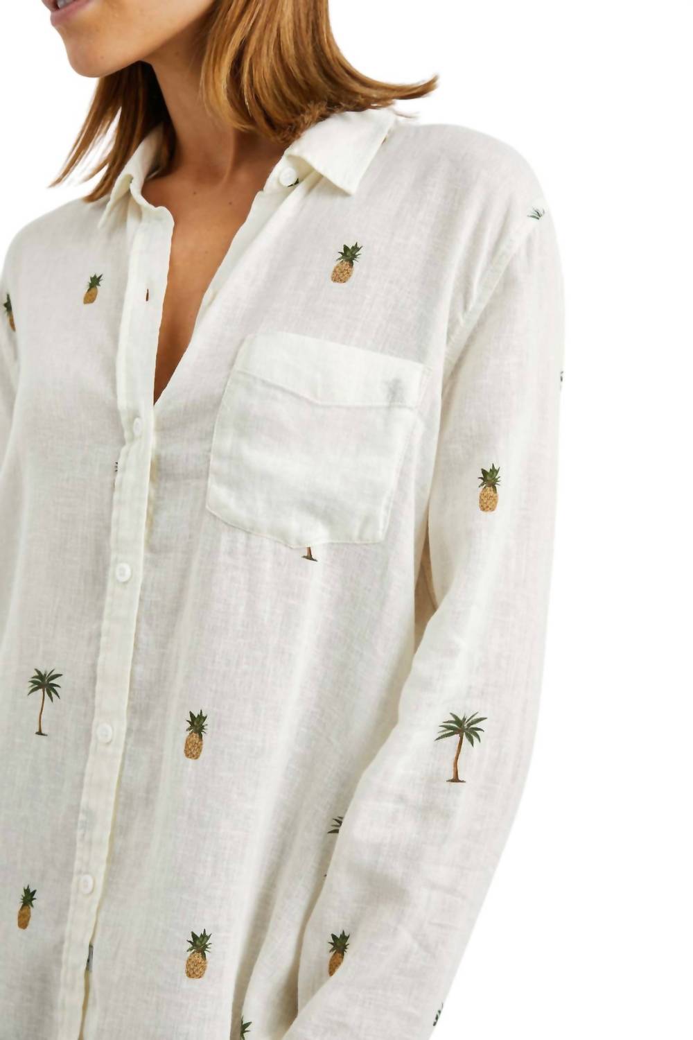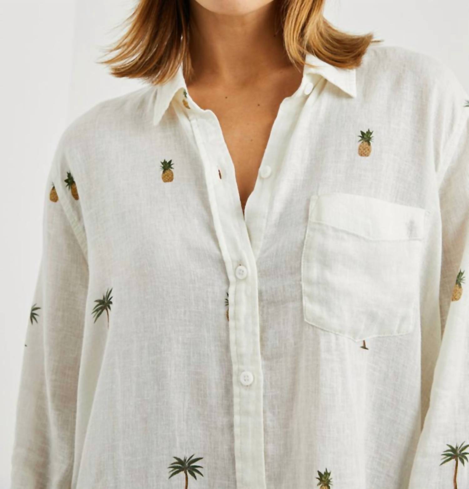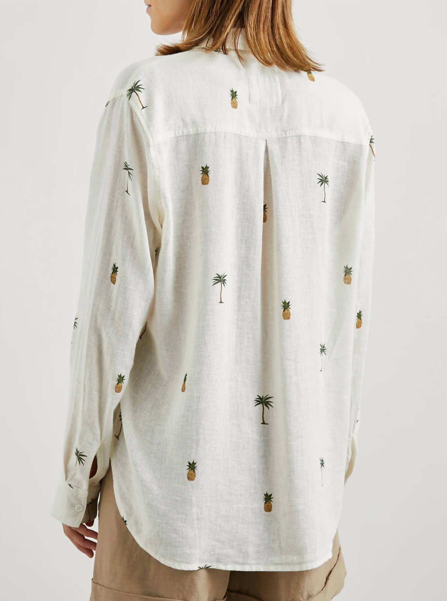Introducing the CHARLI TOP by Rails, a perfect blend of style and comfort with a touch of tropical flair. This white, long sleeve shirt features delightful palm tree and pineapple prints, finished with a classic collar and button closure at the front. Crafted from a lightweight blend of 55% Linen and 45% Rayon, it includes a handy chest pocket and buttoned cuffs. Ideal for hand wash cold care, and true to size for easy and fashionable wear.