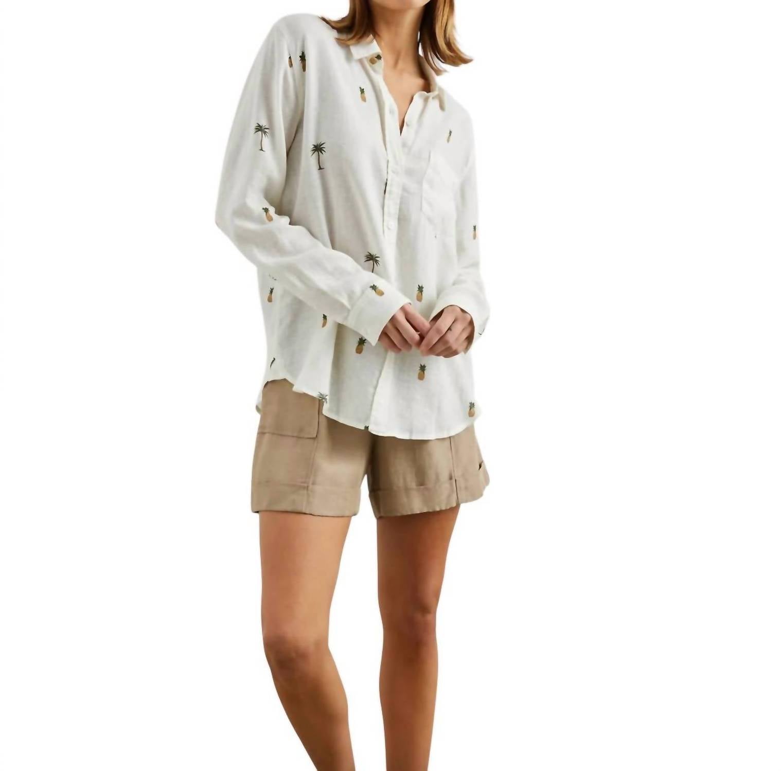 A classic button down shirt that will never go out of style. Introducing the CHARLI TOP by Rails, a perfect blend of style and comfort with a touch of tropical flair. This white, long sleeve shirt features delightful palm tree and pineapple prints, finished with a classic collar and button closure at the front. Crafted from a lightweight blend of 55% Linen and 45% Rayon, it includes a handy chest pocket and buttoned cuffs. Ideal for hand wash cold care, and true to size for easy and fashionable wear.