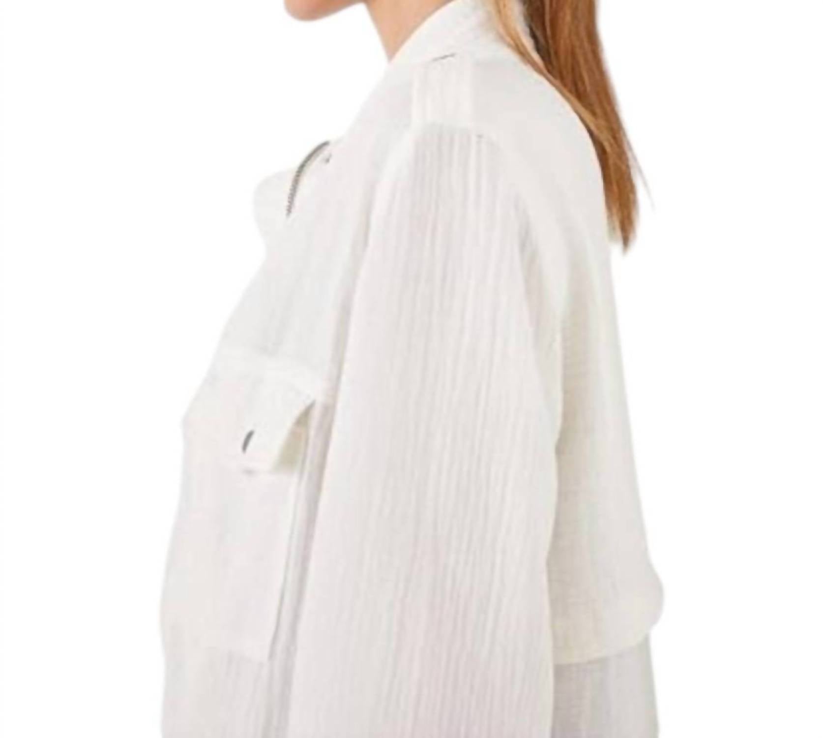 A casual yet cool jacket that every closset needs. Elevate your fall wardrobe with the Rails Collins Jacket, a chic casual piece in a crisp white hue. Designed with long sleeves and a stylish collar, this jacket offers a practical zip closure for easy wear. Crafted from 100% organic cotton, the garment measures 23 inches in length. For best care, hand wash and lay flat to dry.