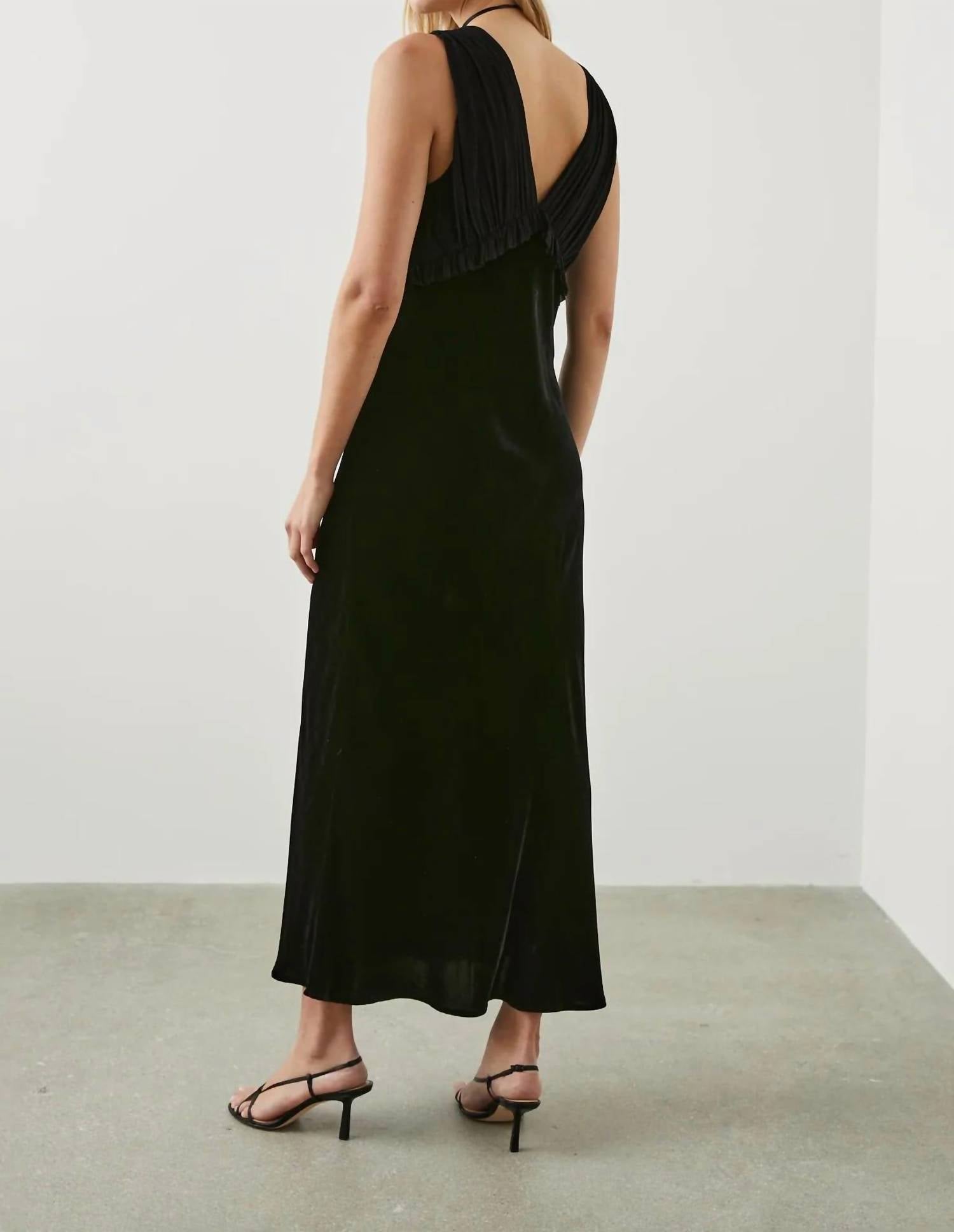 Just add slides or mules and you are good to go. Elevate your winter wardrobe with the Gilda Dress by Rails, a luxurious and versatile addition in black velvet. This women's midi dress beautifully showcases an empire waist silhouette and a sophisticated V-neck neckline, crafted from an 82% Viscose and 18% Silk blend. Designed with a chic sleeveless cut and featuring a comfortable pull-on closure, it measures 50 inches in length from a size small. Perfect for a holiday party, this dress embodies quiet luxury and strikes a harmonious balance between elegance and comfort.