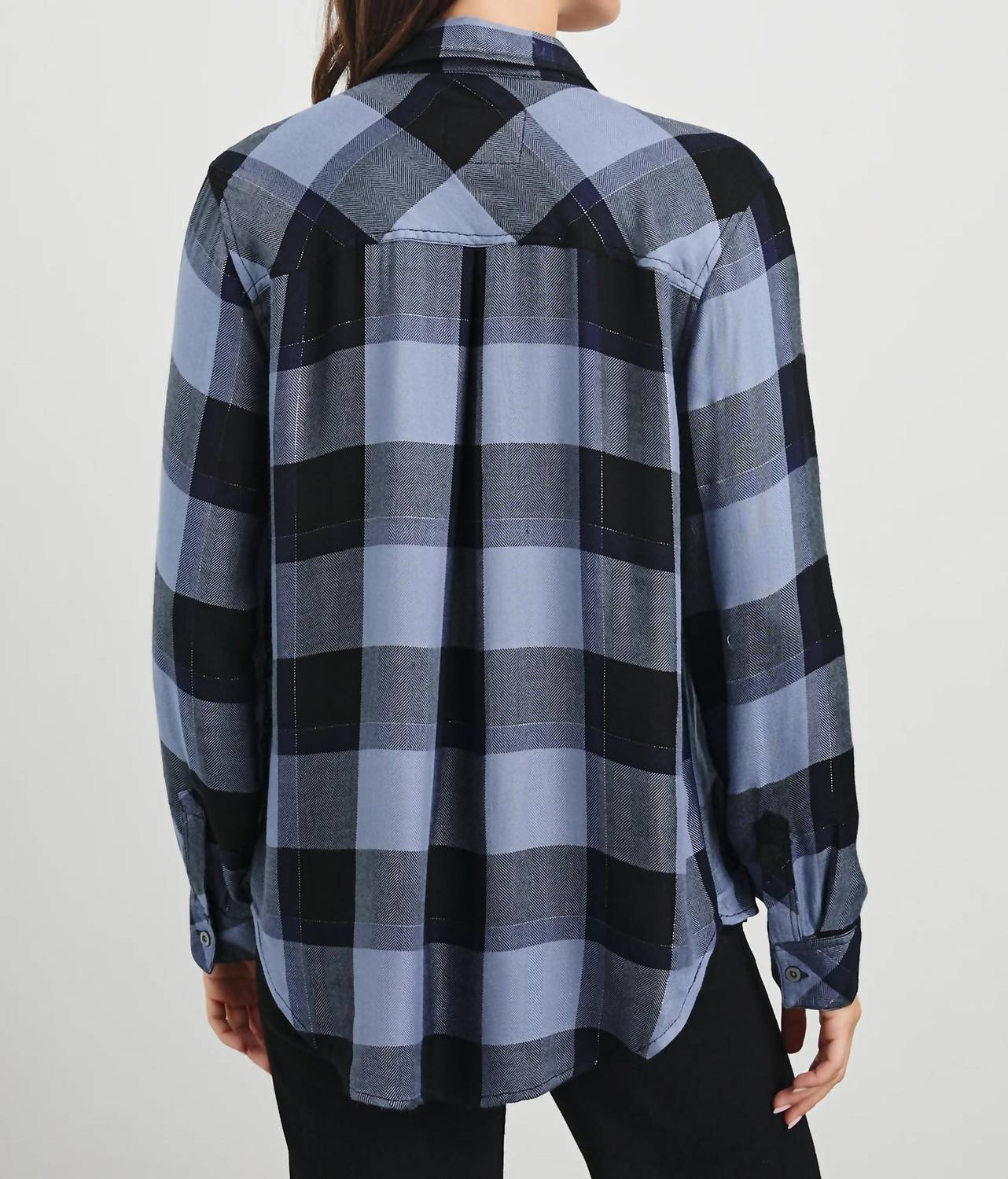 A classic button down shirt that will never go out of style. Timeless button-down crafted in Periwinkle Navy for a chic plaid & check pattern. Made from a signature blend of 98% Rayon and 2% Metallic. Offering an ultra-soft touch with a loose twill weave. Single chest pocket adds a practical yet stylish element. Button closure ensures a classic fit. Designed with the finest details.