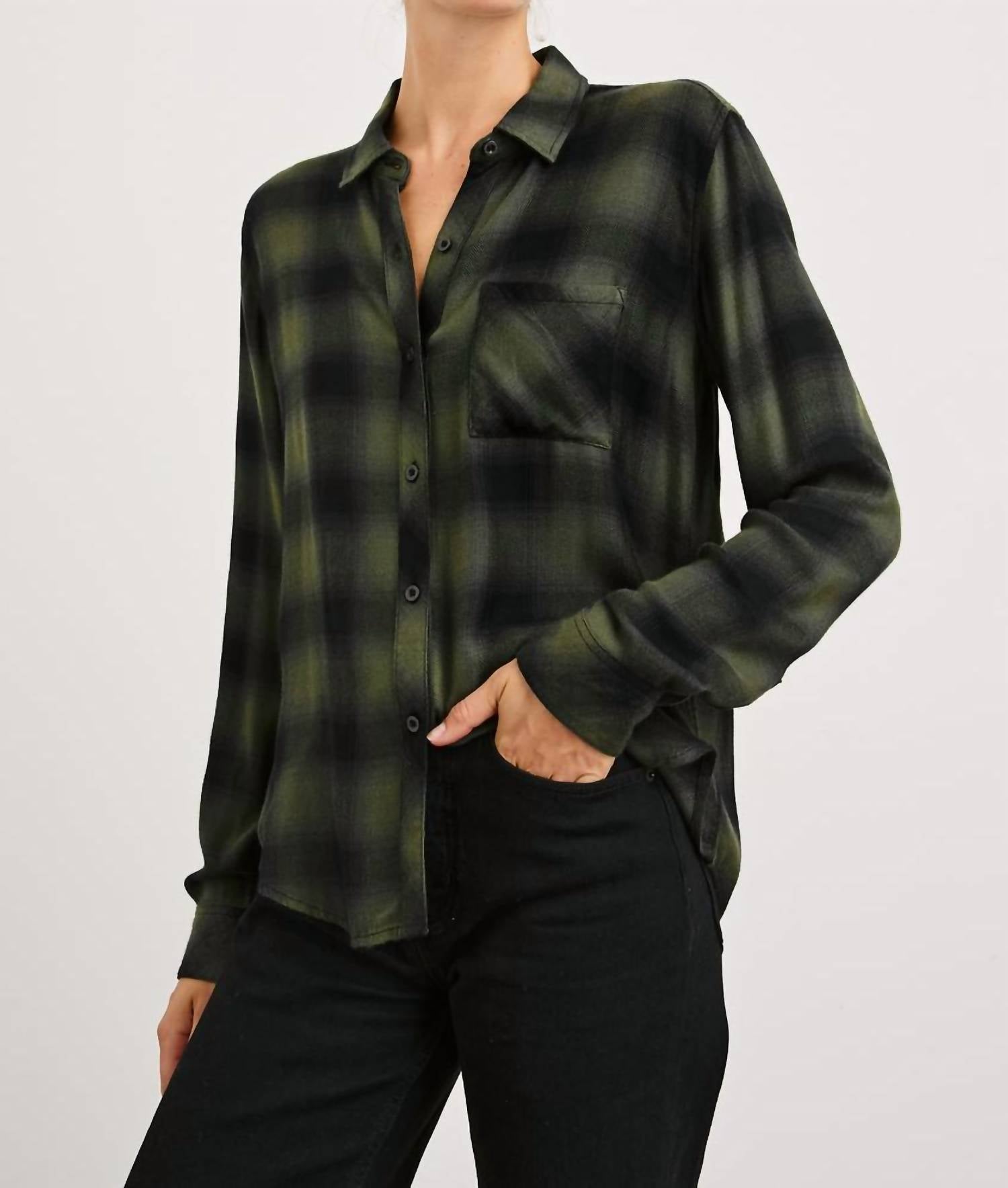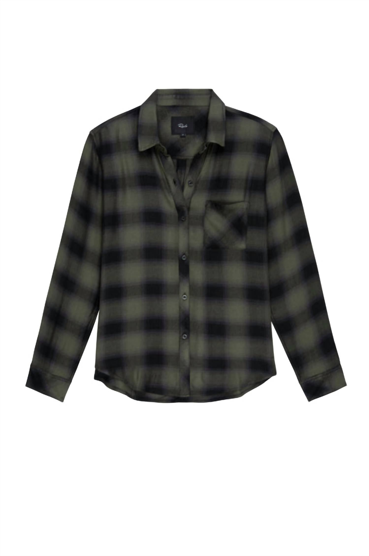Perfectly tailored and soft to the touch. Meet the Hunter Shirt by Rails, a must-have addition for women who appreciate timeless style. Crafted from soft rayon, this button-down shirt features a classic plaid and check pattern in an elegant Olive Shadow Onyx hue. Designed with long sleeves and a collar neckline, it offers both comfort and sophistication. For convenience, it includes pockets and ensures easy maintenance with machine wash instructions.