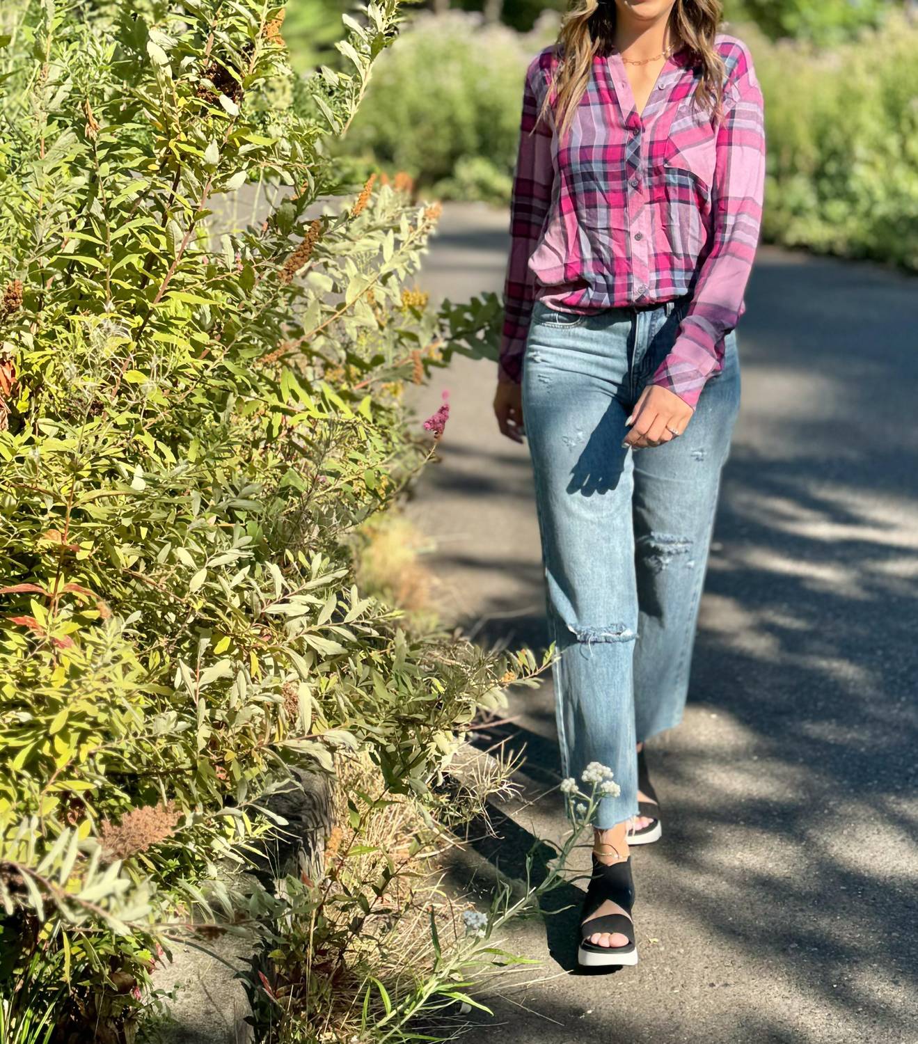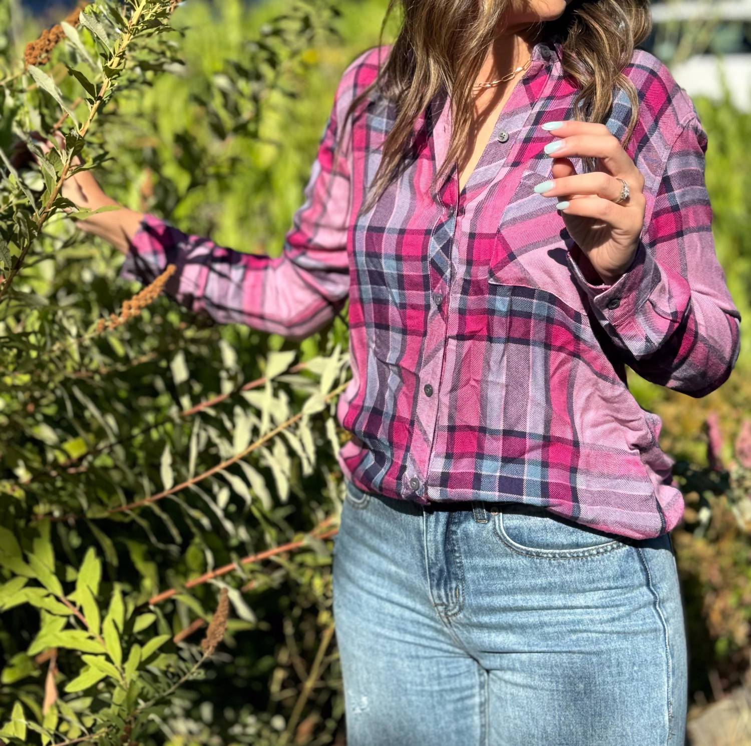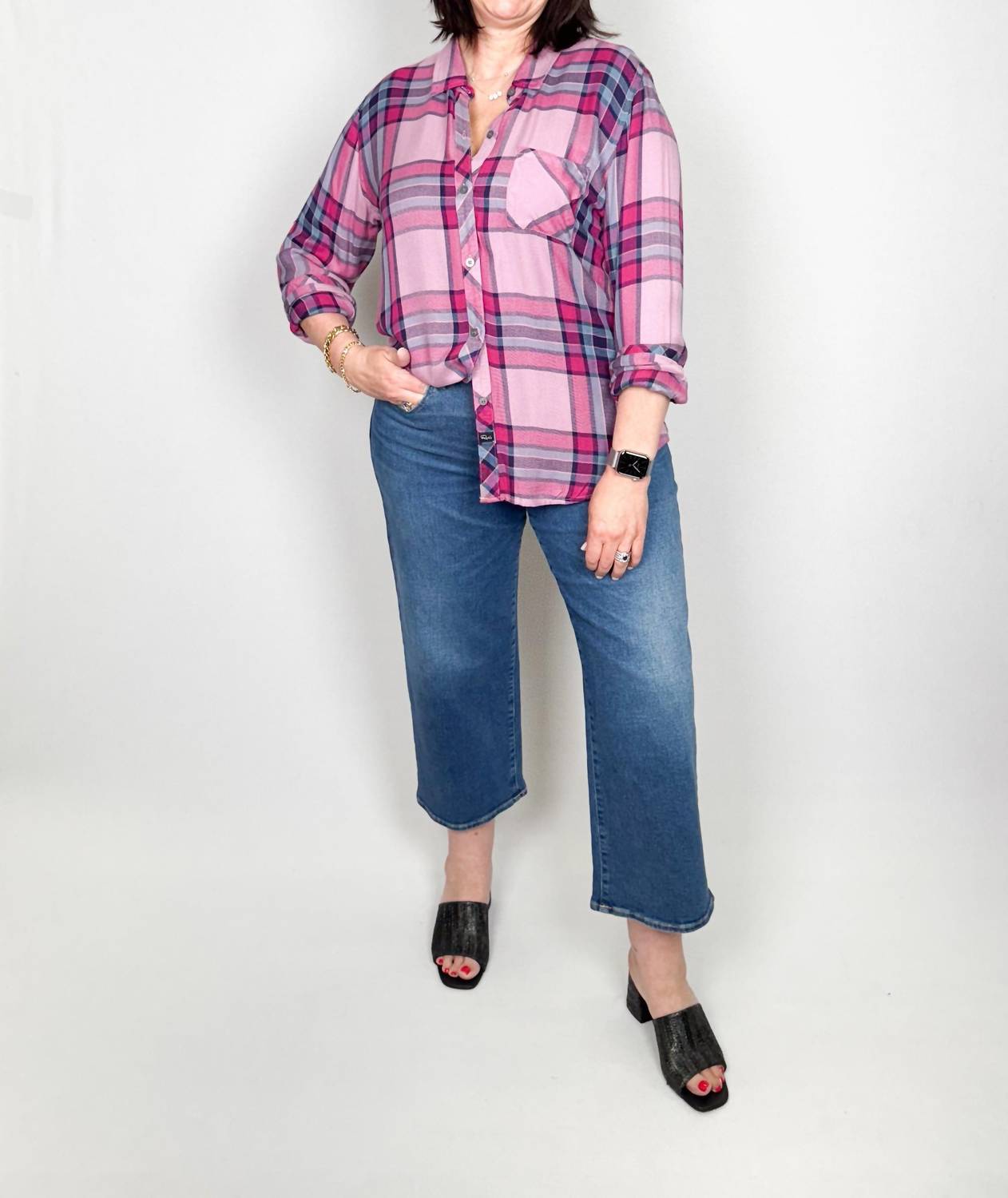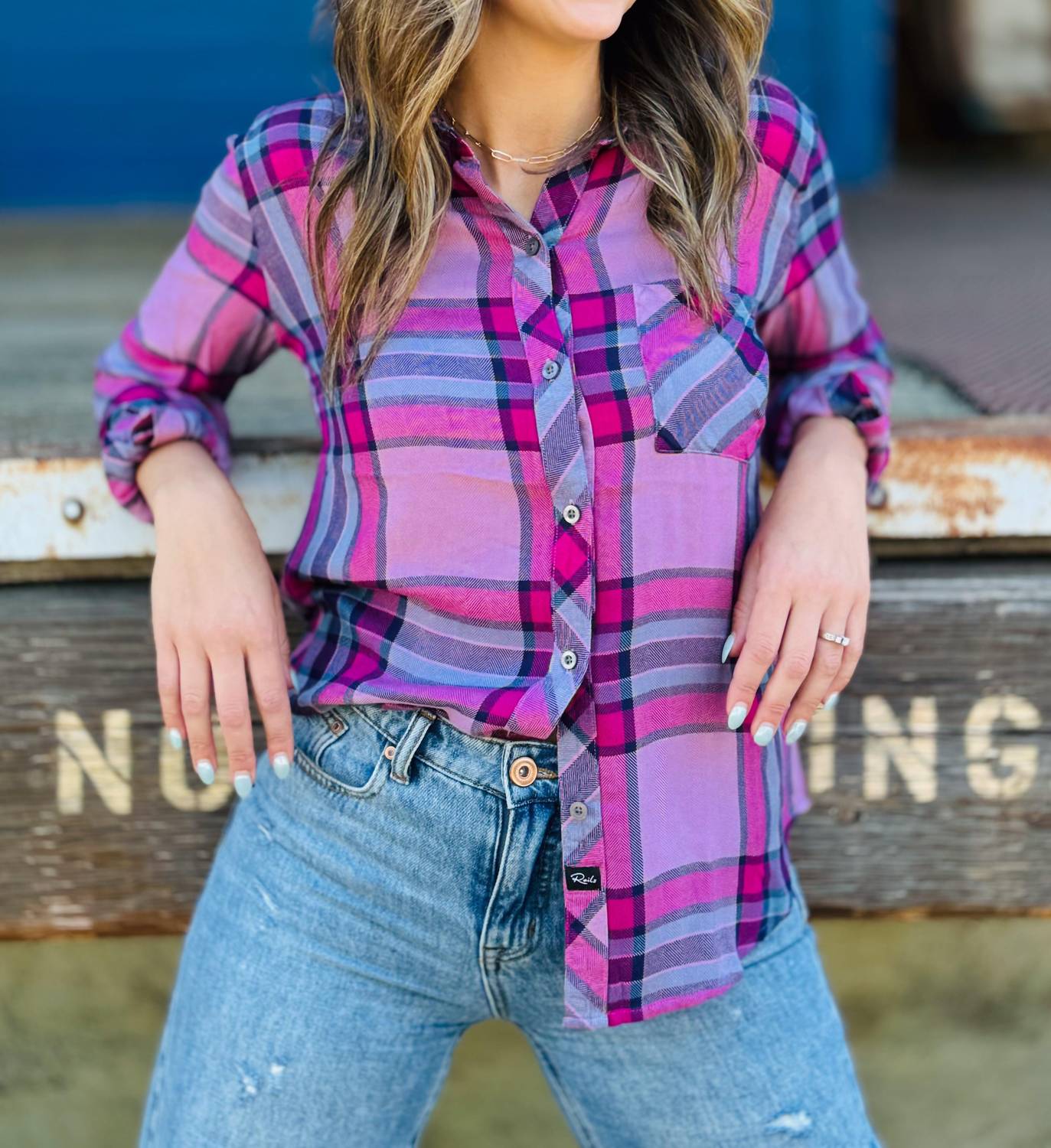 This button down shirt is comfortable yet polished. Discover the Rails Hunter Shirt, a timeless plaid button-down in Twilight that's a must-have for any wardrobe. Featuring long sleeves and a classic collar, it offers a polished look that's perfect for pairing with denim. Crafted from 100% Rayon, this shirt ensures comfort and style. Closure: Button front. Care: Hand wash cold, line dry, low iron if needed.