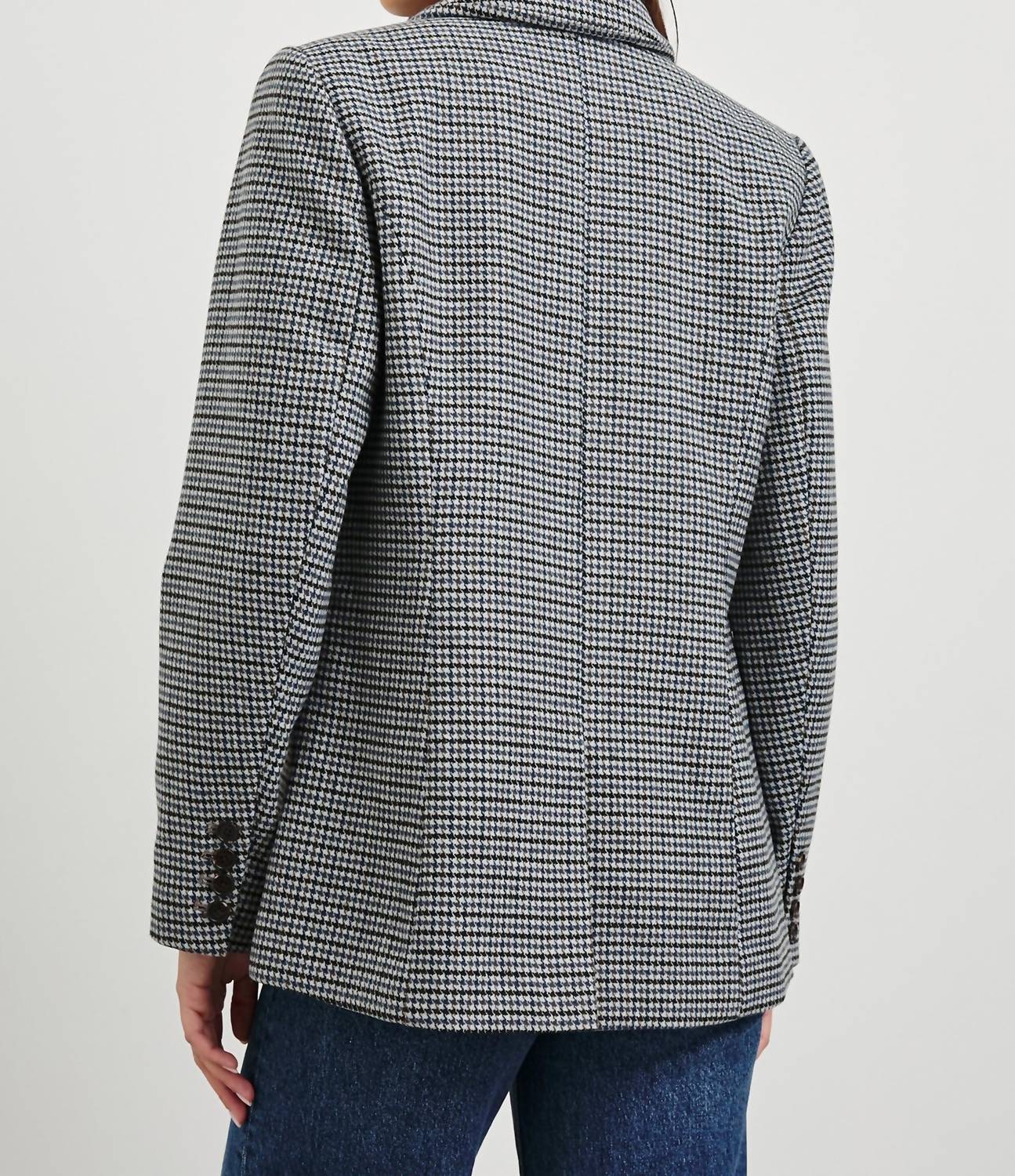An elevated version of your favorite classic blazer. Introducing the Jac Long Sleeve Button Front Blazer by Rails, a chic addition to your workwear and evening wardrobe in stylish Black Lapiz. With its long sleeves and a blend of 90% polyester and 10% wool, this blazer showcases a V-neck with notched lapels and a button closure. It features a thoughtful design with patterned fabric, functional flap pockets, and faux horn buttons for a polished look. Care instructions include hand washing and laying flat to dry, making it an exquisite choice for fall occasions like Thanksgiving.