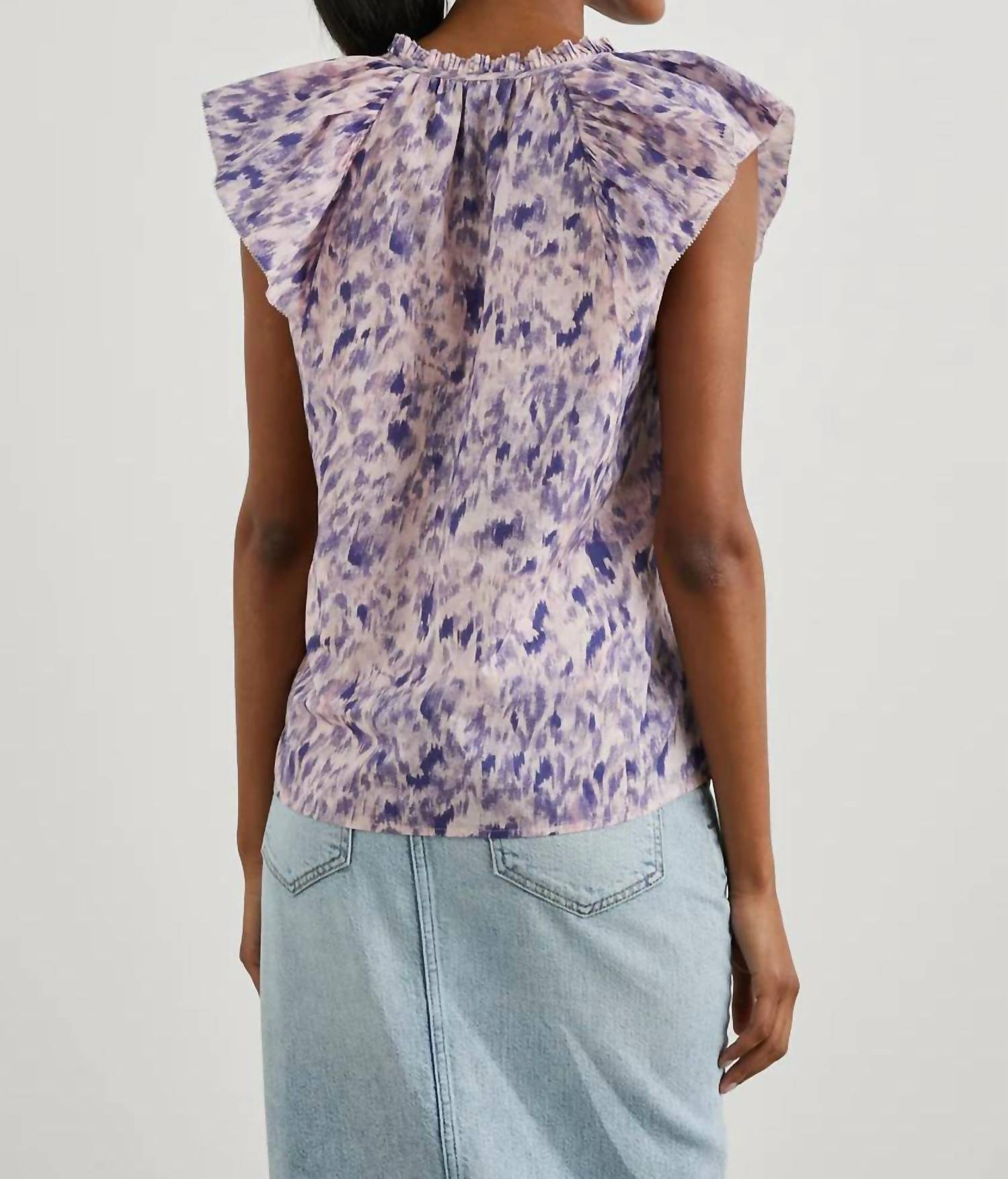 Discover effortless elegance with the Karysa Top by Rails, a must-have in a charming purple hue. This women's blouse crafted from 100% cotton features a flattering V-neckline and cap flutter sleeves, perfect for a breezy look. The pull-on design adds ease to your style, enhanced by a stunning floral pattern. Care for this piece is simple: machine wash and lay flat to dry.