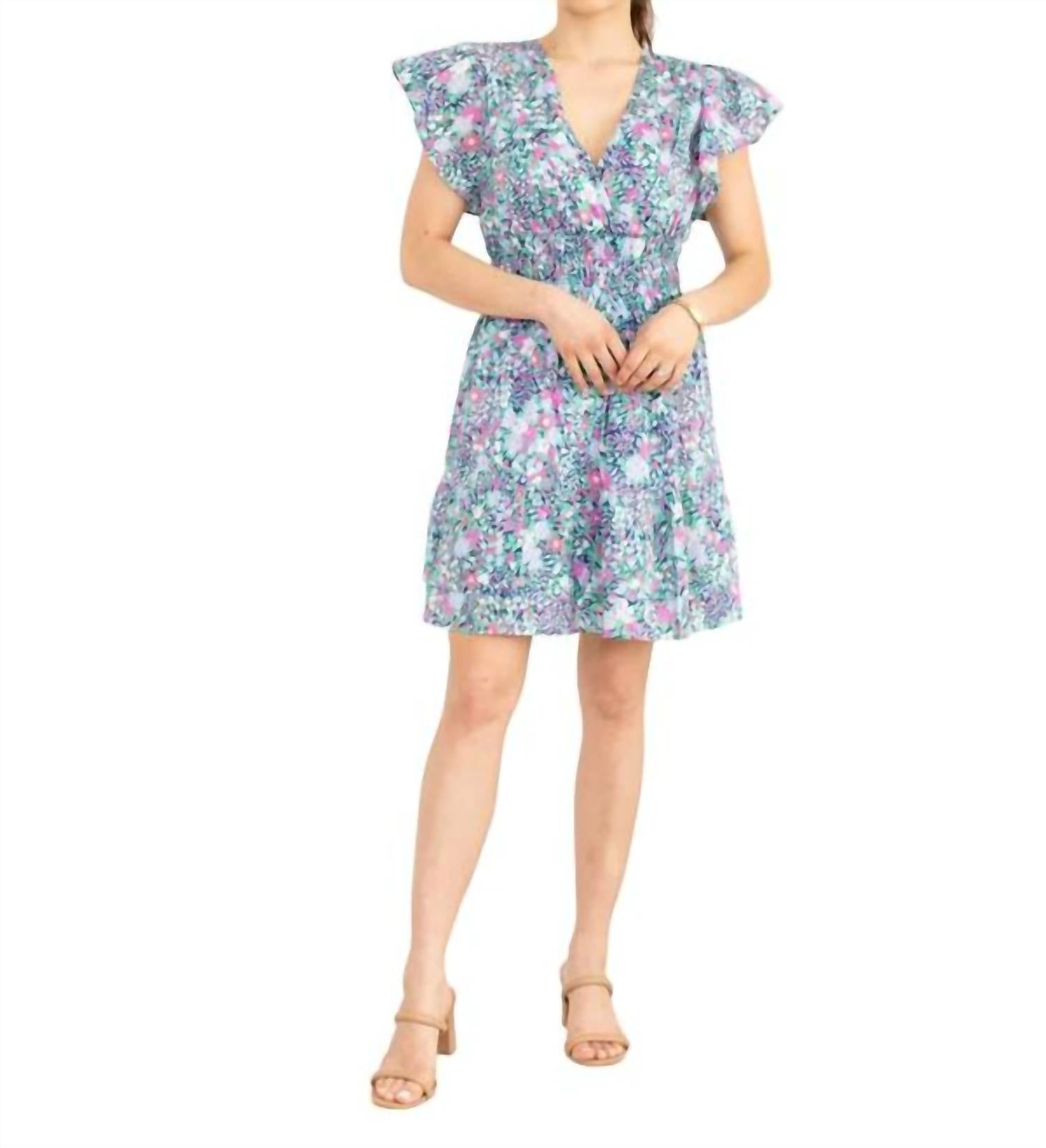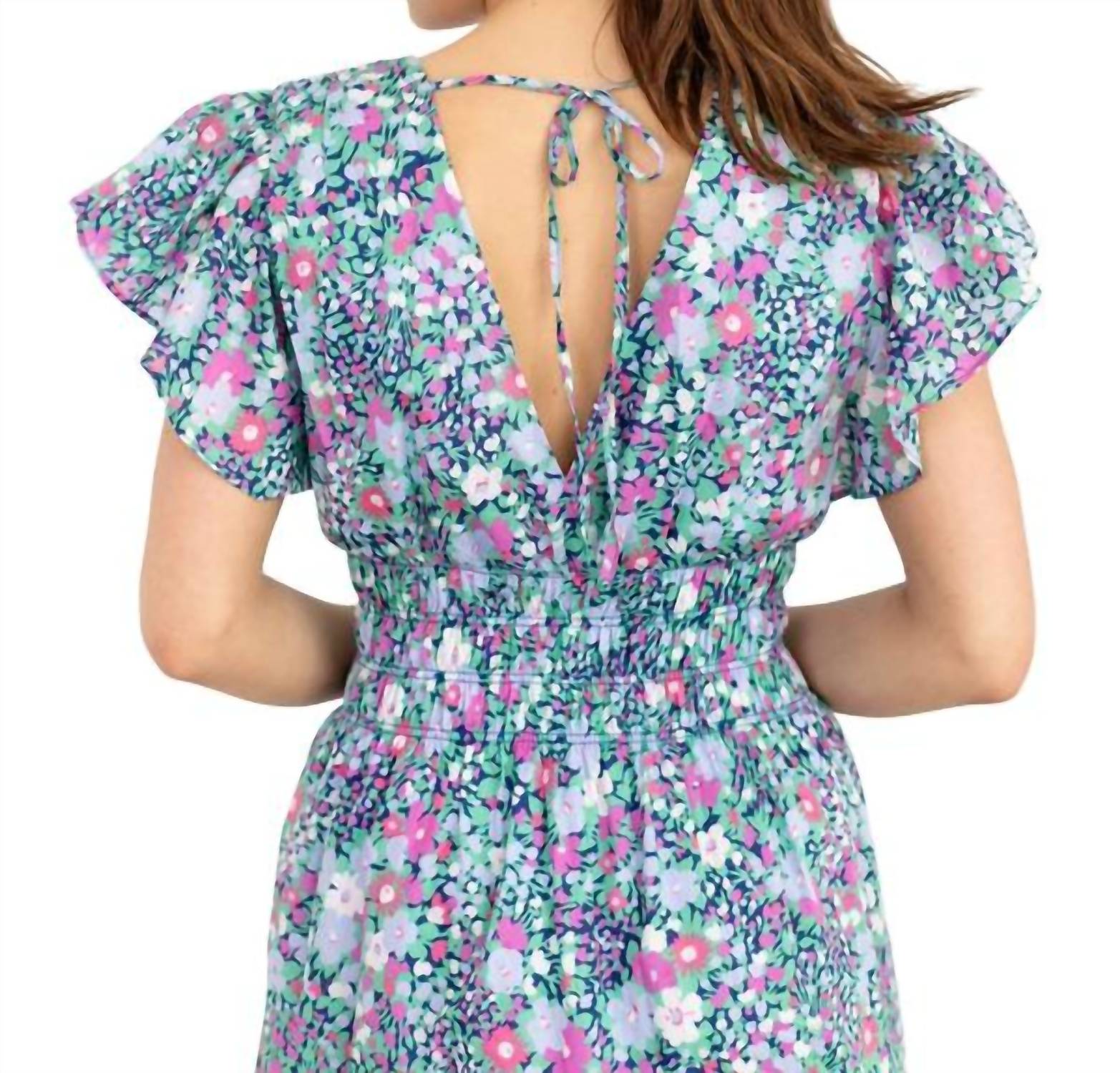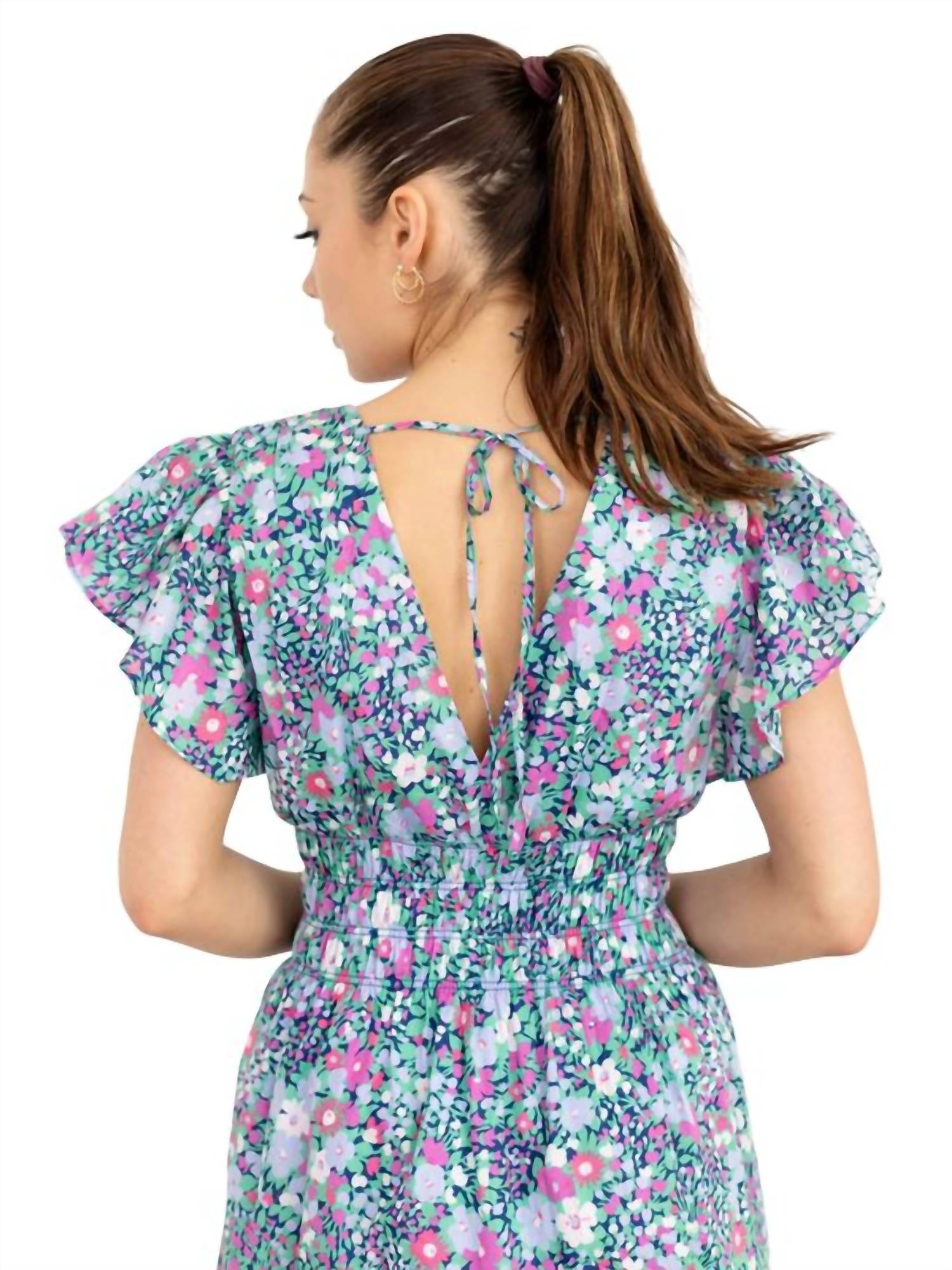 A short and breezy dress for those warmer days. Floral mini dress featuring a V-neckline and flutter sleeves. Open back with a tie closure. Smocked waistband. Hand wash. 100%.Cotton.