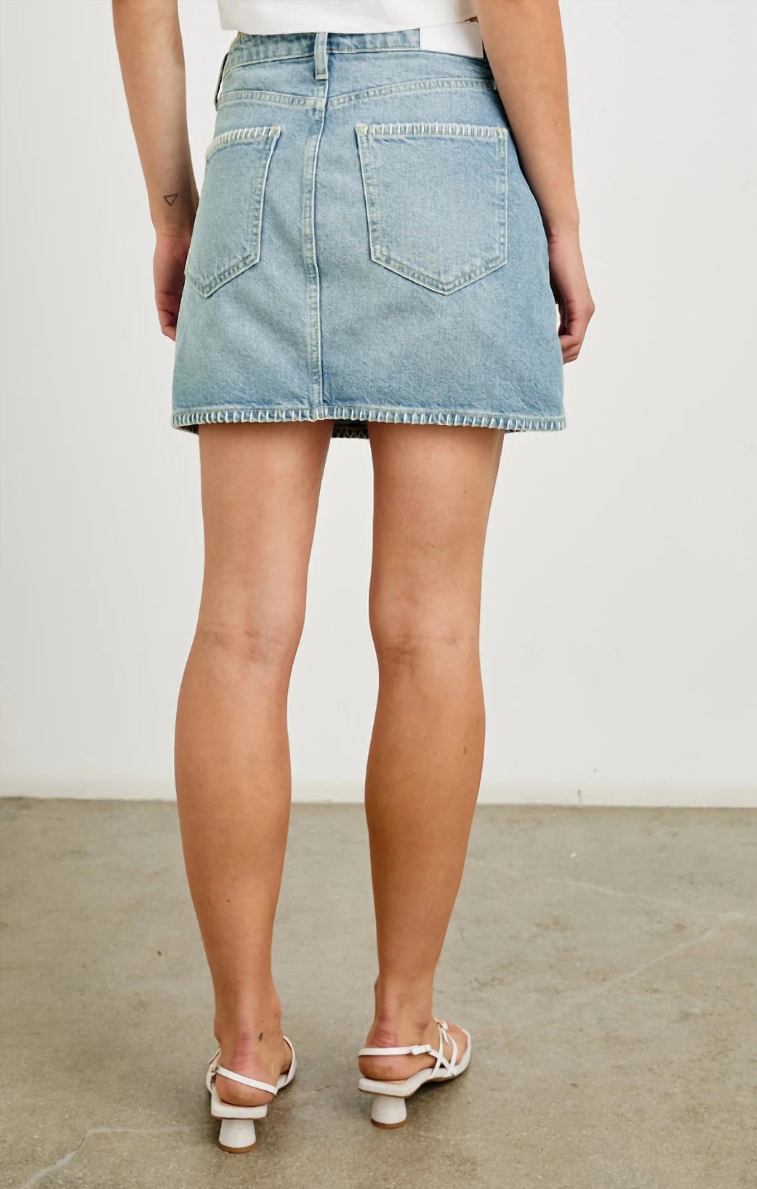 The Rails Laurel Mini Skirt in Harbor Blanket Stitch is a nod to the iconic 90s "It Girl" style, perfect for summer vacations or Thanksgiving occasions. Crafted from 100% cotton, this mini skirt showcases a high-rise, fitted waist and an A-line shape, accentuated by contrast white blanket stitching. It features a practical button closure for easy wear, along with a zipper fly. With a length of 15 3/4 inches measured from size Small, this skirt is best suited to machine washing and tumble drying, ensuring easy care and maintenance.