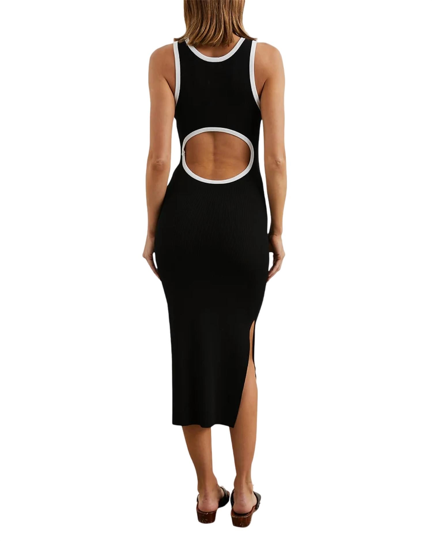 The perfect length dress does exist. Rails "Rue" rib-knit dress finished with contrasting trim. Approx. 47.5"L from shoulder to hem. Round neckline. Sleeveless. Back keyhole cutout. Thigh-high side slit. Hem falls below the knee. Body-skimming fit. Slipover style. Dry clean. 76% Viscose, 24% Nylon.