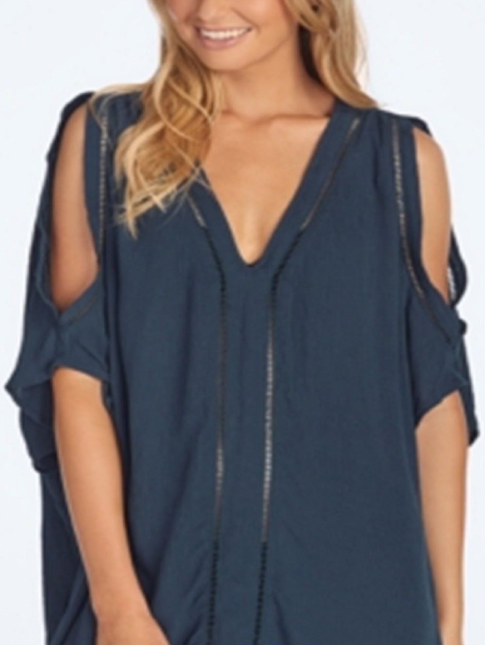 Breezy beach style is yours in this flowing cover-up from Raisins| a relaxed caftan silhouette accented by chic crochet and cutouts that let your shoulders greet the sun. | V-neck; pull on styling| Crochet trim at neckline| front and cutouts| Cold shoulder cutouts; handkerchief hem