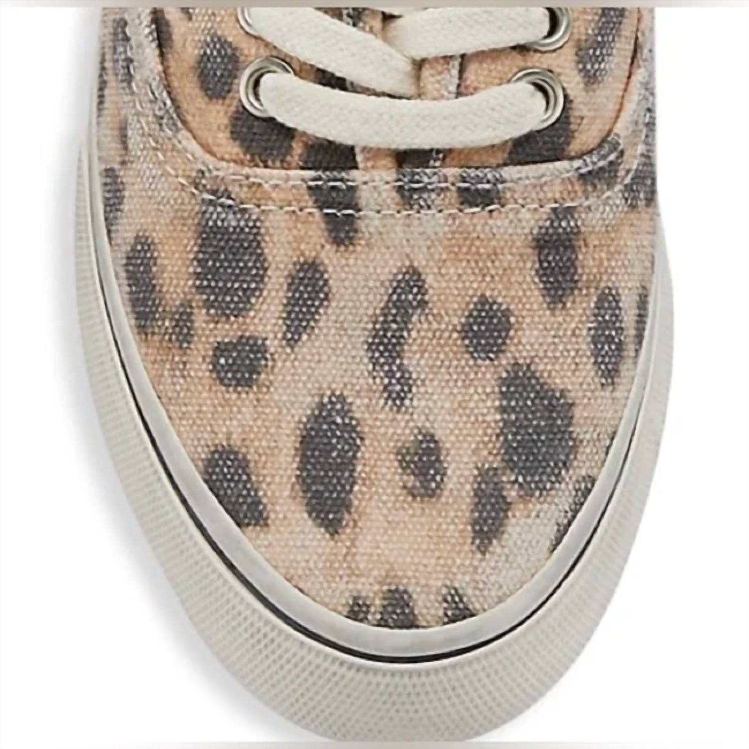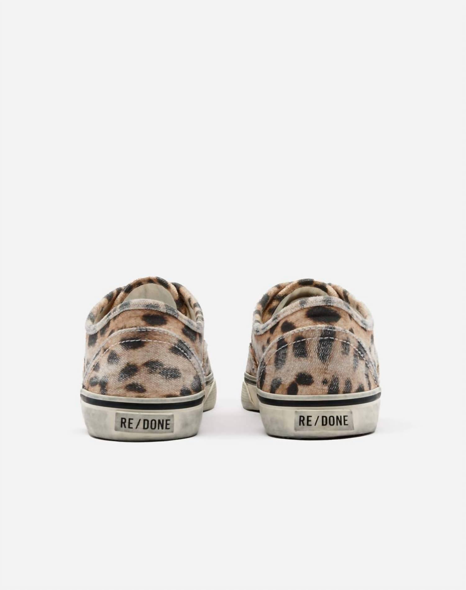 Get your daily steps in with these adorable sneakers. Introducing the Women's 70s Low Top Skate Sneaker by RE/DONE, a perfect blend of style and functionality. Crafted from 100% canvas with a faded leopard print, these handcrafted sneakers offer a distinct grunge appeal. Featuring a flat, round toe and a raised heel pad, they are ideal for summer travels. Defined by their low-top design and RE/DONE branding on the back heel, these sneakers epitomize the classic skate style.