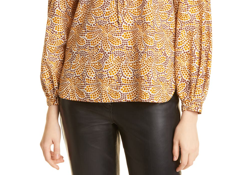 Speckled Fleur Marig abstract floral print | Size 12 | Nordstrom exclusive | Long sleeved | High| ruffled neckline | Button front | Made by Rebecca Taylor | Bold| vibrant design | Silk blend fabric | Loose| comfortable fit