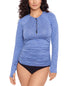 As a rash guard or coverup| this Reebok top offers sun protection and a stylish look. A zip closure and adjustable ruched sides let you change up the line and the coverage.| Hits at hip| Pull-on styling with front zipper; long sleeves with thumbholes| Crewneck; ruched ties at sides; sun protection| Lined| Shell