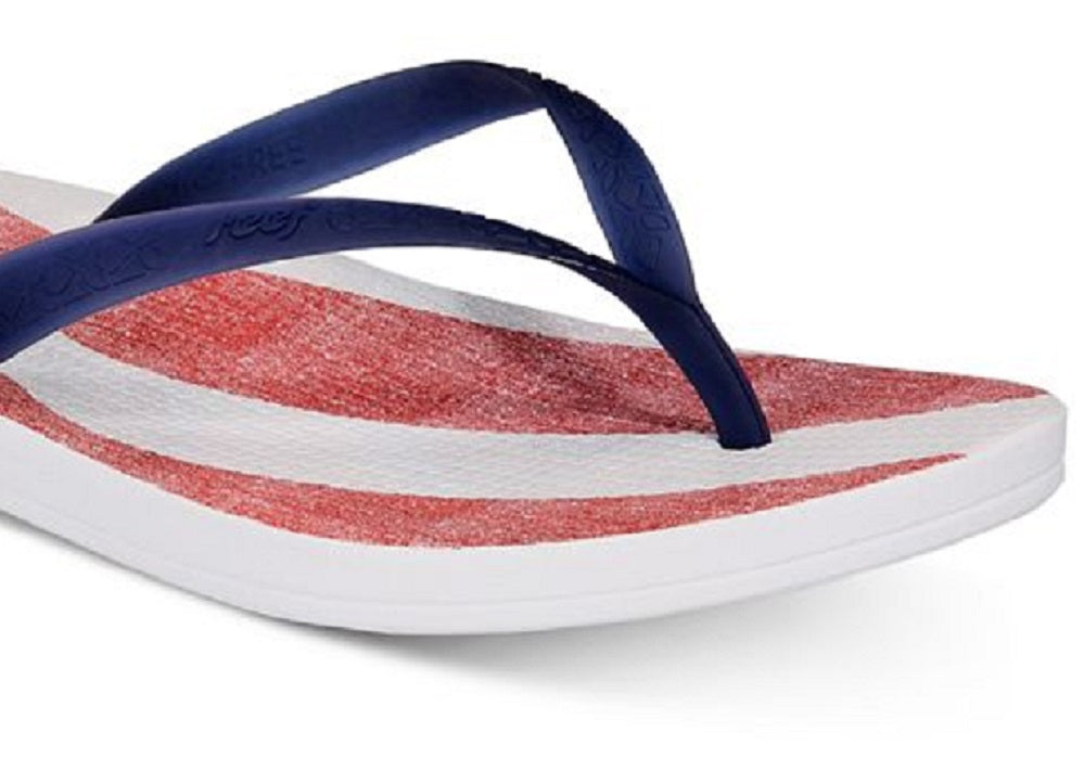 REEF's Escape Lux flip-flops are a beach-ready go-to in classic form with a warm-weather splash of red| white and blue.| Round-toe slip-on thong flip-flop sandals| Wide tapered strap with reef logo; printed footbed| Eco-one organic additive to enchance biodegradability| 100% PVC FREE| Contoured comfort with arch support and heel cupping