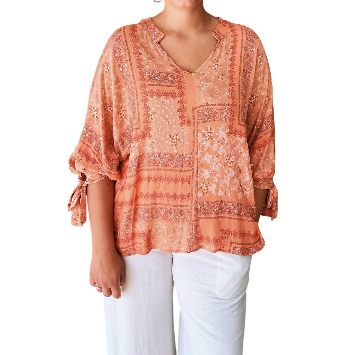 Discover effortless style with the Boho Paisley Top by ReneeC., a chic addition to your wardrobe in a captivating coral hue. This women's blouse features playful self-tie, three-quarter sleeves and a breezy V-neck, offering a loose and flowy fit for a comfortable, bohemian vibe. Made from 100% rayon, this pull-on top is proudly crafted in the USA, ideal for your spring travels or casual days. Care: Machine wash cold and hang to dry.