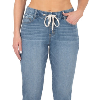 Pull on cool| comfy style with these denim jogger pants from Rewash.| Approx. inseam; 27| Front rise; approx. 9-3/4; back rise; approx. 15-1/4; relaxed leg opening; 10 extends to 13-1/2 | Pull-on style with front tie| Cuffed hems| Cotton/polyester/rayon/spandex