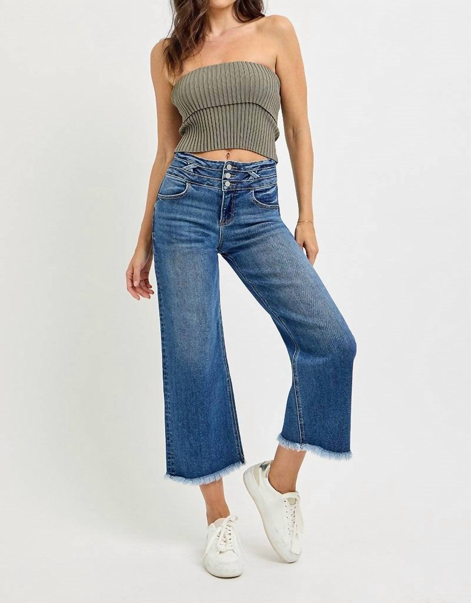 Fit to perfection, we love these high-waist jeans and you will too. Elevate your denim collection with the Risen High Rise Crop Wide Band Detail Jeans in a versatile blue hue. Perfect for a relaxed fit, these jeans feature a flattering 10 1/2" rise and a 26 1/2" inseam, designed in a comfortable wide leg style. Composition: 93% Cotton, 5% Polyester, 2% Spandex. Closure: Button closure. Care: Machine wash, tumble dry.