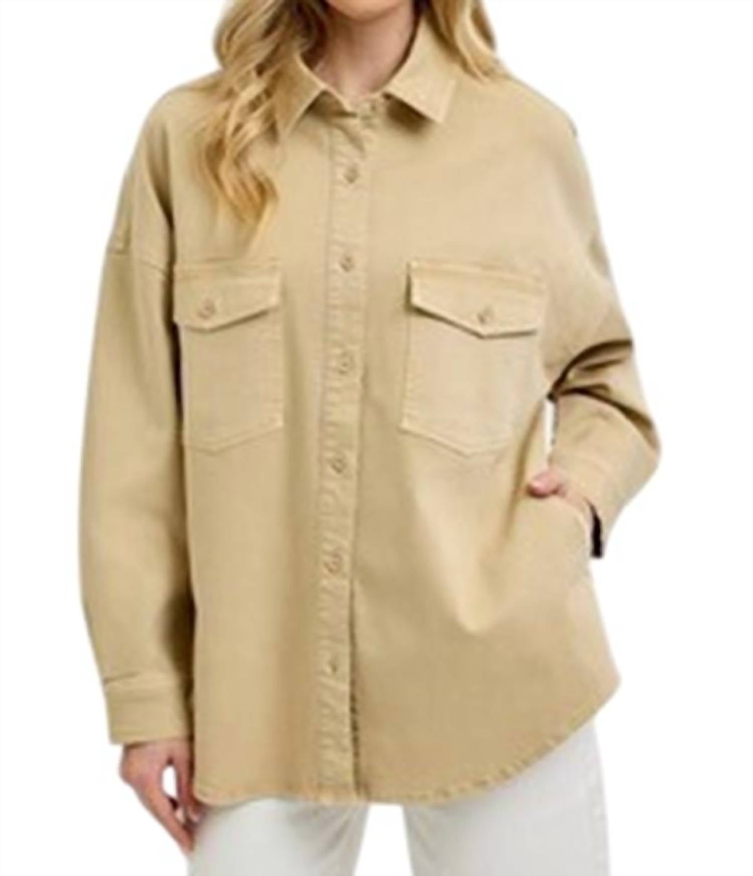 Cute, casual, and comfortable. This jacket is a must have. Elevate your streetwear collection with the Oversized Shirt Jacket from RISEN, boasting a chic collar and practical pockets for everyday convenience. Designed in a solid latte hue, this casual jacket features long sleeves and a classic button closure. Closure: Button closure. Care: Hand wash and line dry. Perfect for travel and autumn strolls.