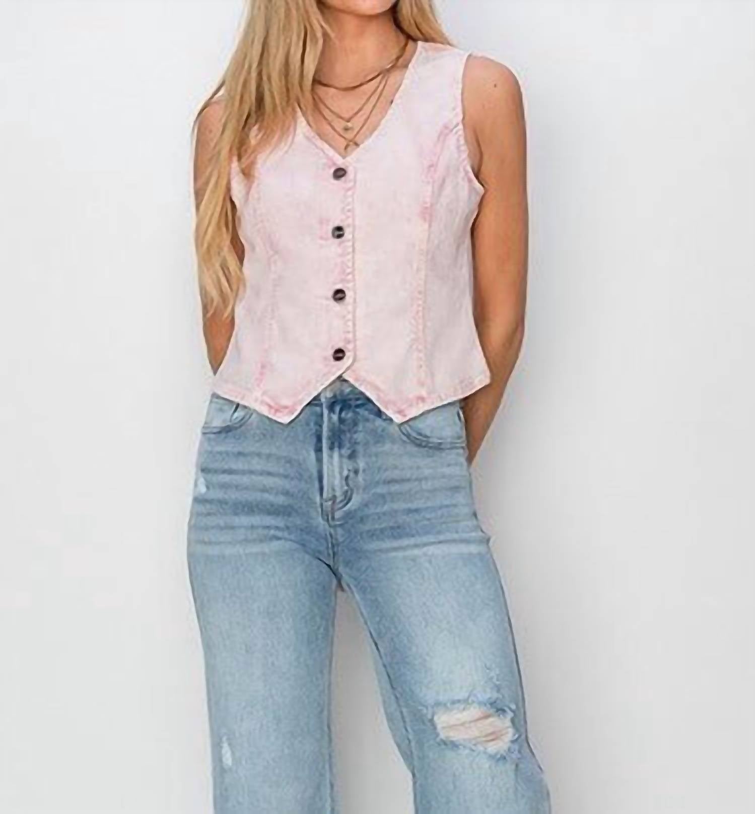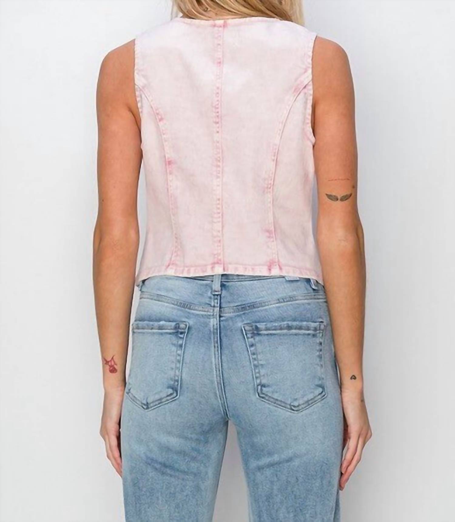 Throw this vest over an all black outfit for a perfectly polished look. Introducing the Vera Denim Sleeveless Vest by RISEN, a chic and playful addition to your summer wardrobe. Crafted with a 98% Cotton and 2% Spandex blend, this vest offers a flattering V-neckline and a convenient button closure for effortless style. Featuring a solid pink hue, the garment measures 21.75 inches in length and is true to size with a chest measurement of 35 inches for size S. Care for this versatile piece is simple: machine wash and line dry as needed.